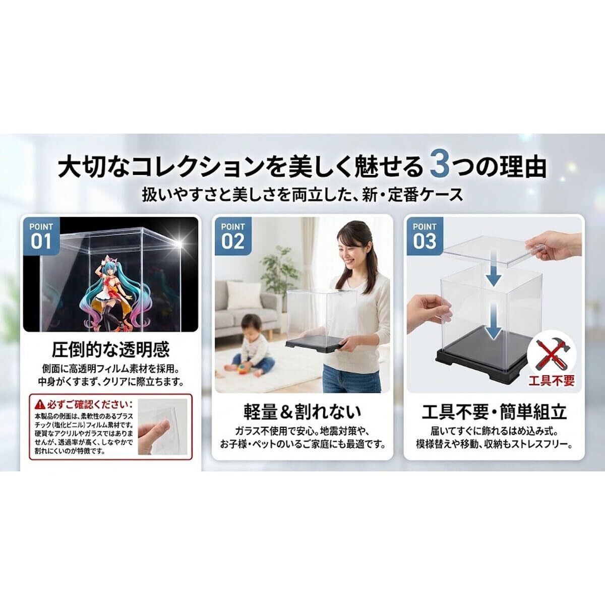 コレクションケースは底板(黒色厚さ約1mm)及び天板(透明)はプラスチック(厚さ約1mm)、側面(周囲)は透明のプラスチックシート(塩化ビニール厚さ0.35から0.5mm)で形成されています。