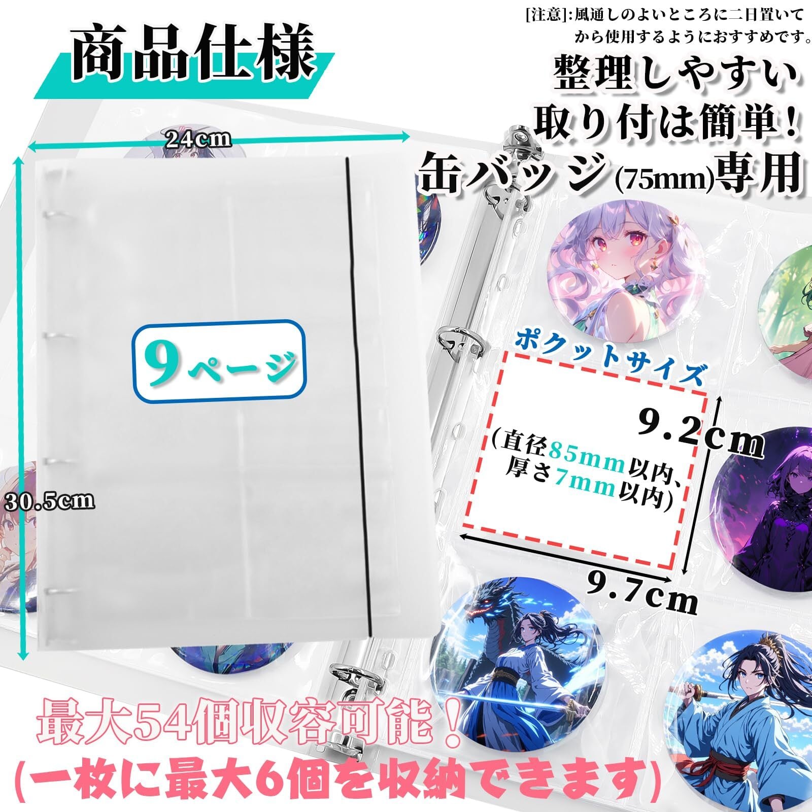 缶バッジ専用 収納 サイズ:缶バッジ 収納、カードページ全体サイズ24×30.5×3㎝、単一グリッドサイズ9.2x9.7CM、 直径85㎜以内の缶バッジ、厚み7㎜以内。壊れにくくて、ホコリ防止。切なコレクションを保管するのに便利! (ご注意:本製品ですので、素材はPP素材で、少し匂いがあるかもしれない、しばらく風を通せば匂いがきえます、どうか大目に见てください)
