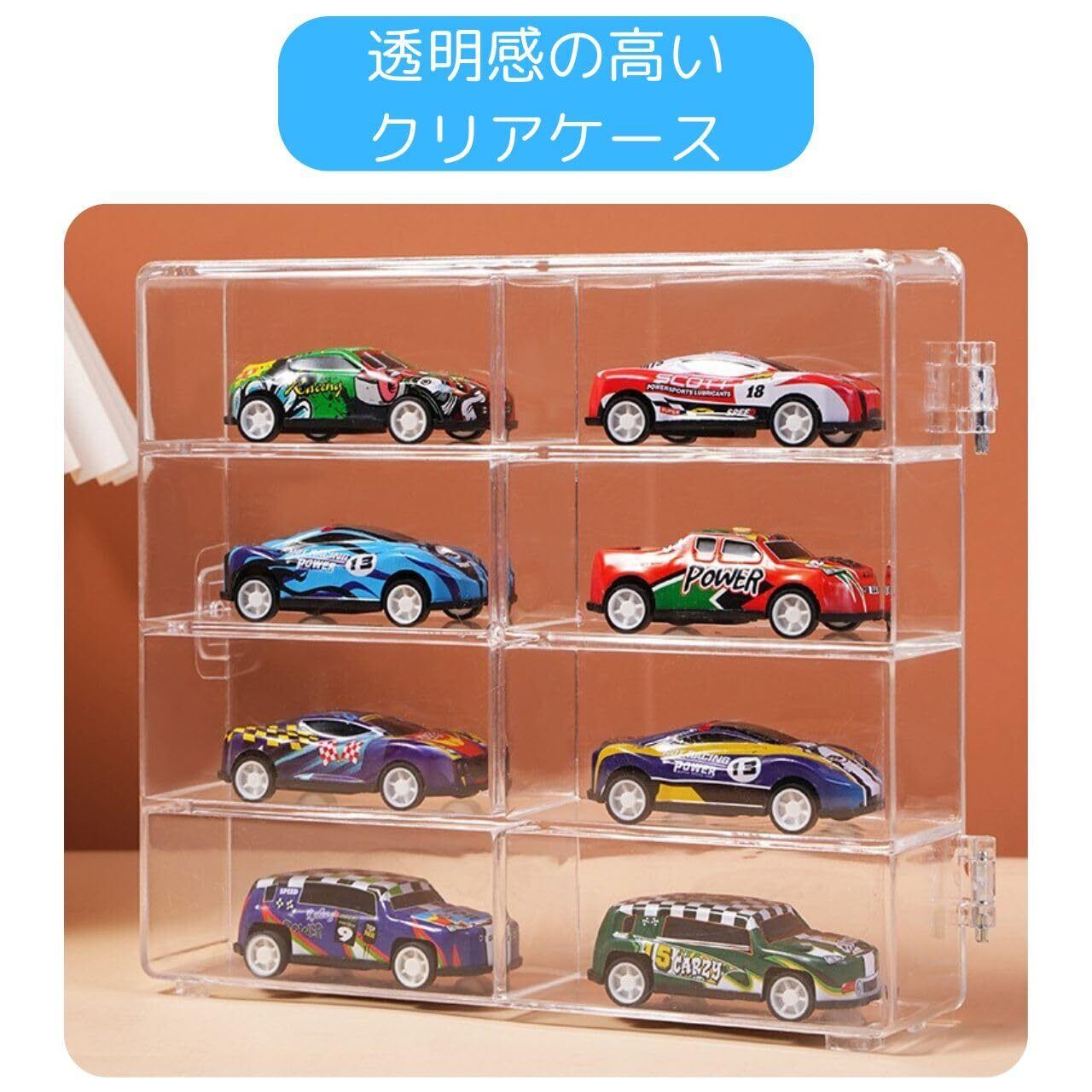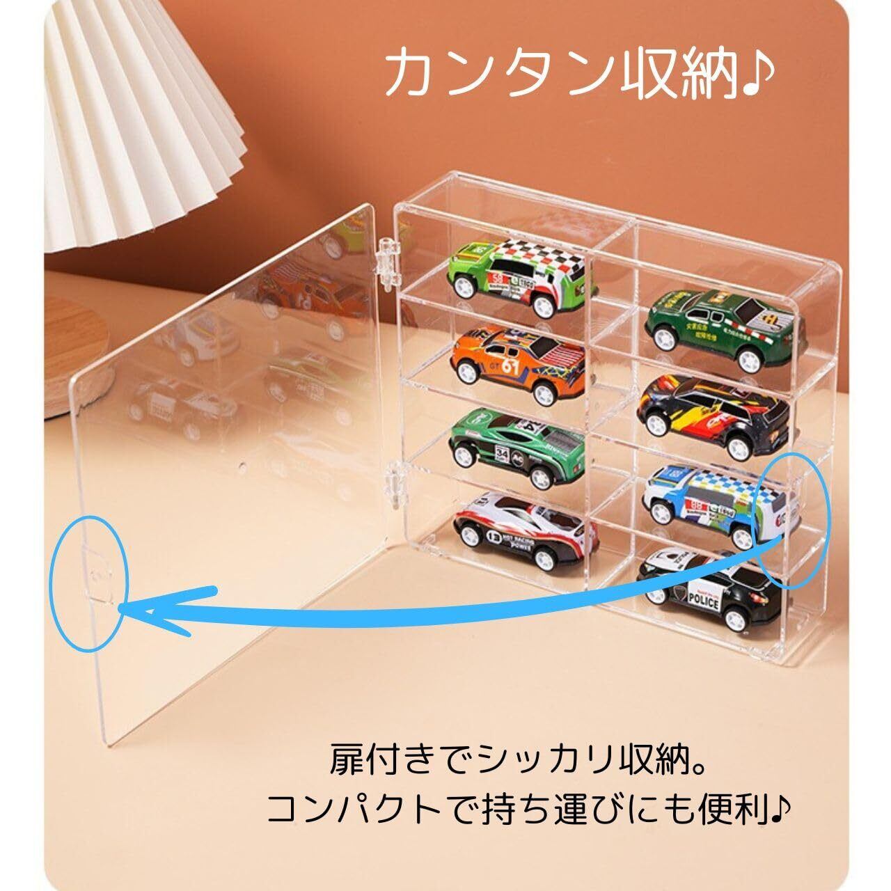 【シンプルで簡単収納】扉を開けて1つ1つ収納していくだけ。お子様のお片付けの練習にもなります。1つのケースに8台。軽くてコンパクト。お子様でも使い勝手の良いケースです。