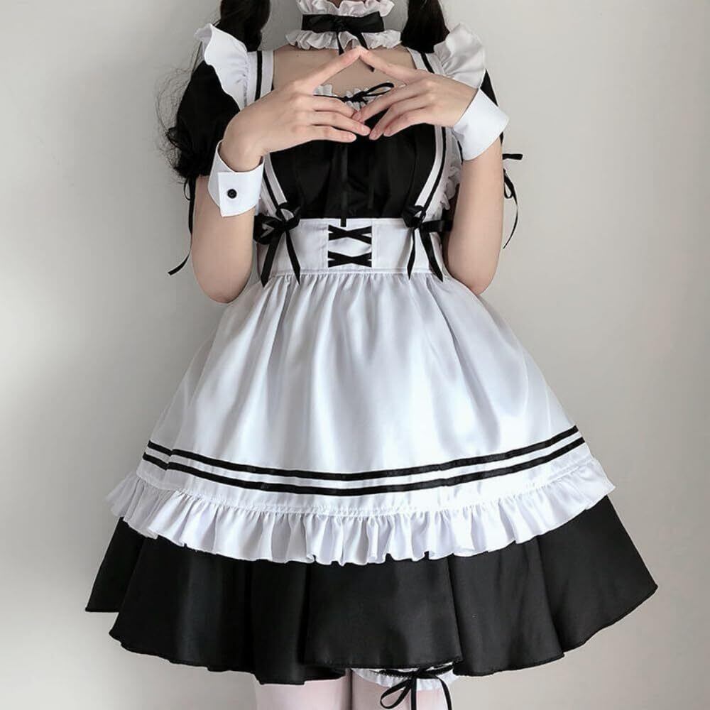 【新春セール】メイド 服 コスプレ ショート丈 豪華7点セット メイド エプロン ニーハイソックス付き かわいい 大きいサイズ メイドコスチューム 仮装 コンカフェ パーティー 大人 ハロウィン クリスマス 男女兼用 レディース メンズ S/M/L/XL/2XL/3XL/4XL