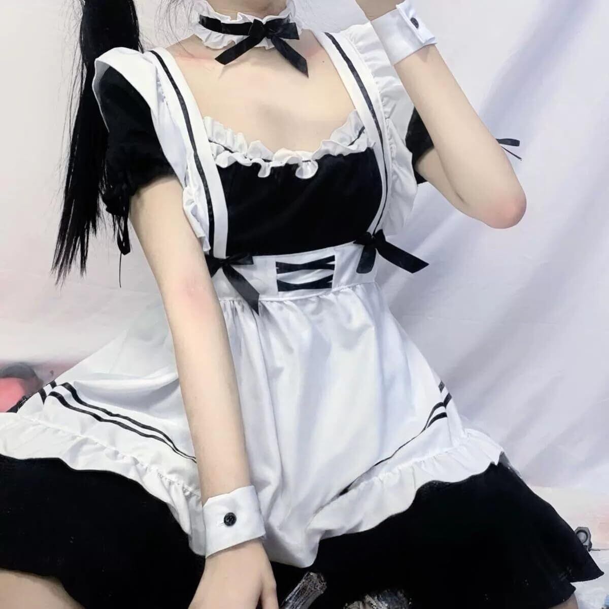 セット内容:メイド服、カチューシャ、ニーハイソックス、太もも飾り、腕飾り、首飾り。