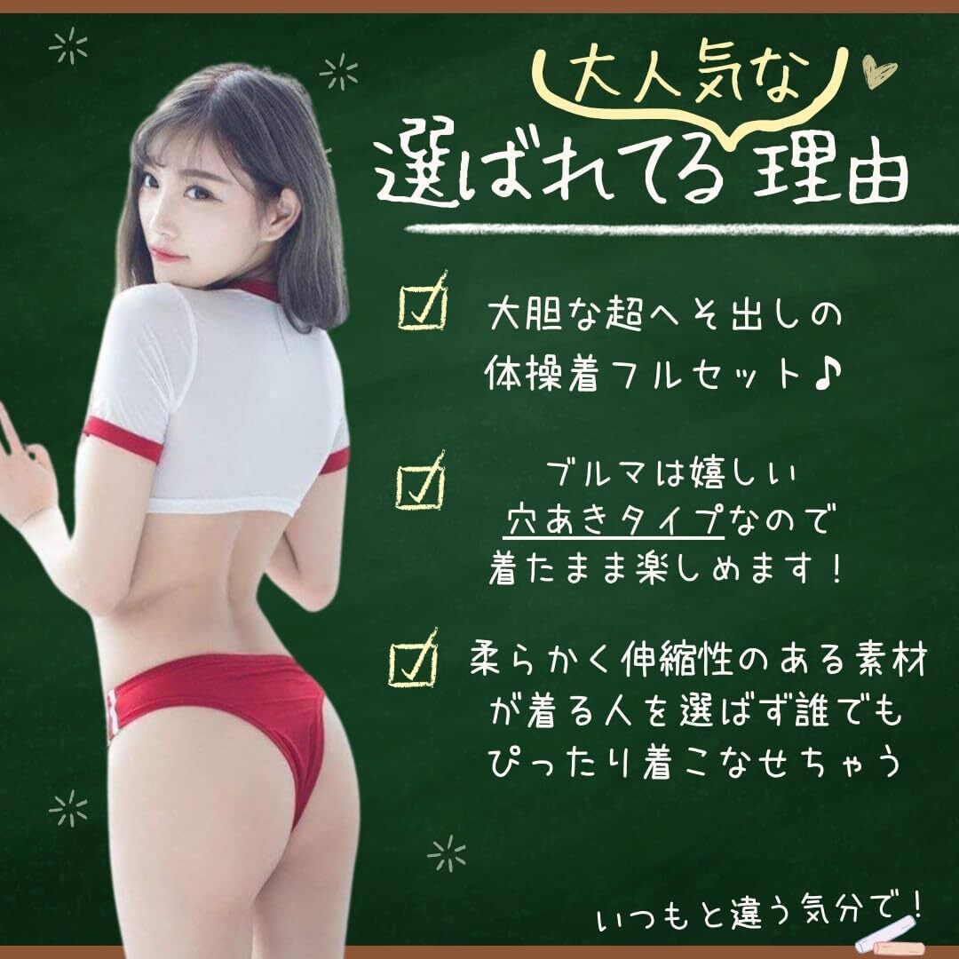 【特徴1】ブルマタイプで大胆な超へそ出しが可愛い大人気でド定番 の体操着フルセットブルマは嬉しい穴あきタイプなので着たまま楽しめます!ウエストラインに視線釘付けは間違いないです