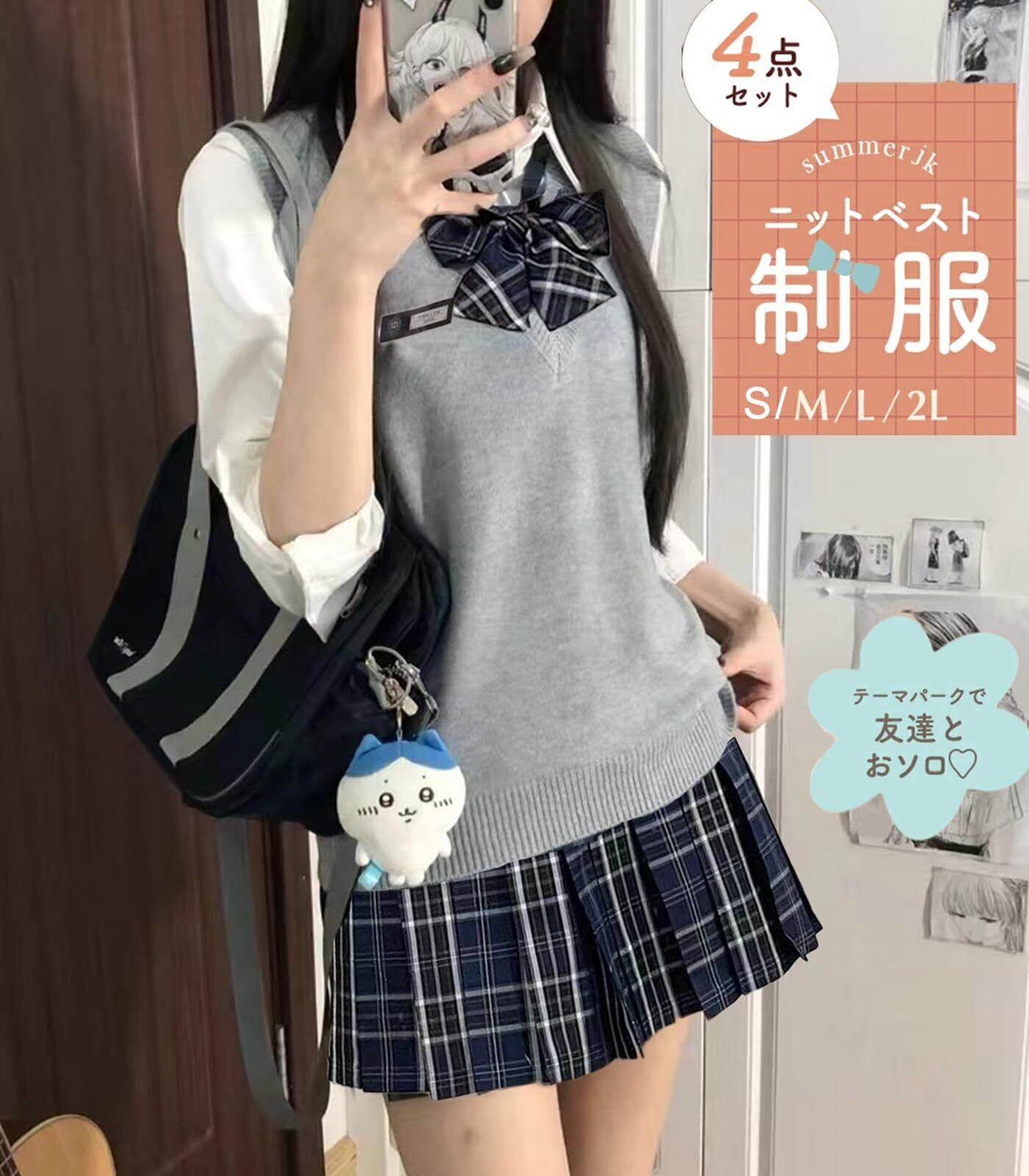 コスプレ 制服 女子 4点セット ニットベスト 白シャツ プリーツスカート 蝶結び スクール制服 女子高生 可愛い コスチューム スクール仮装 遊園地 学園祭 文化祭 卒業式
