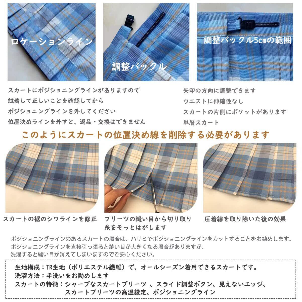【素材&質感】シャツ:ポリエステル70%、綿30%,ネクタイ、リボン&スカート:ポリエステル100%。これはユニフォームのための特別な生地で、滑らかな表面、明確な線、厚くて柔らかい質感、優れたドレープ、着用時にしわや縮みがありません。 ウエストの調整バックルは5cmの範囲で調整できるので、不適切なサイズをあまり気にする必要はありません。