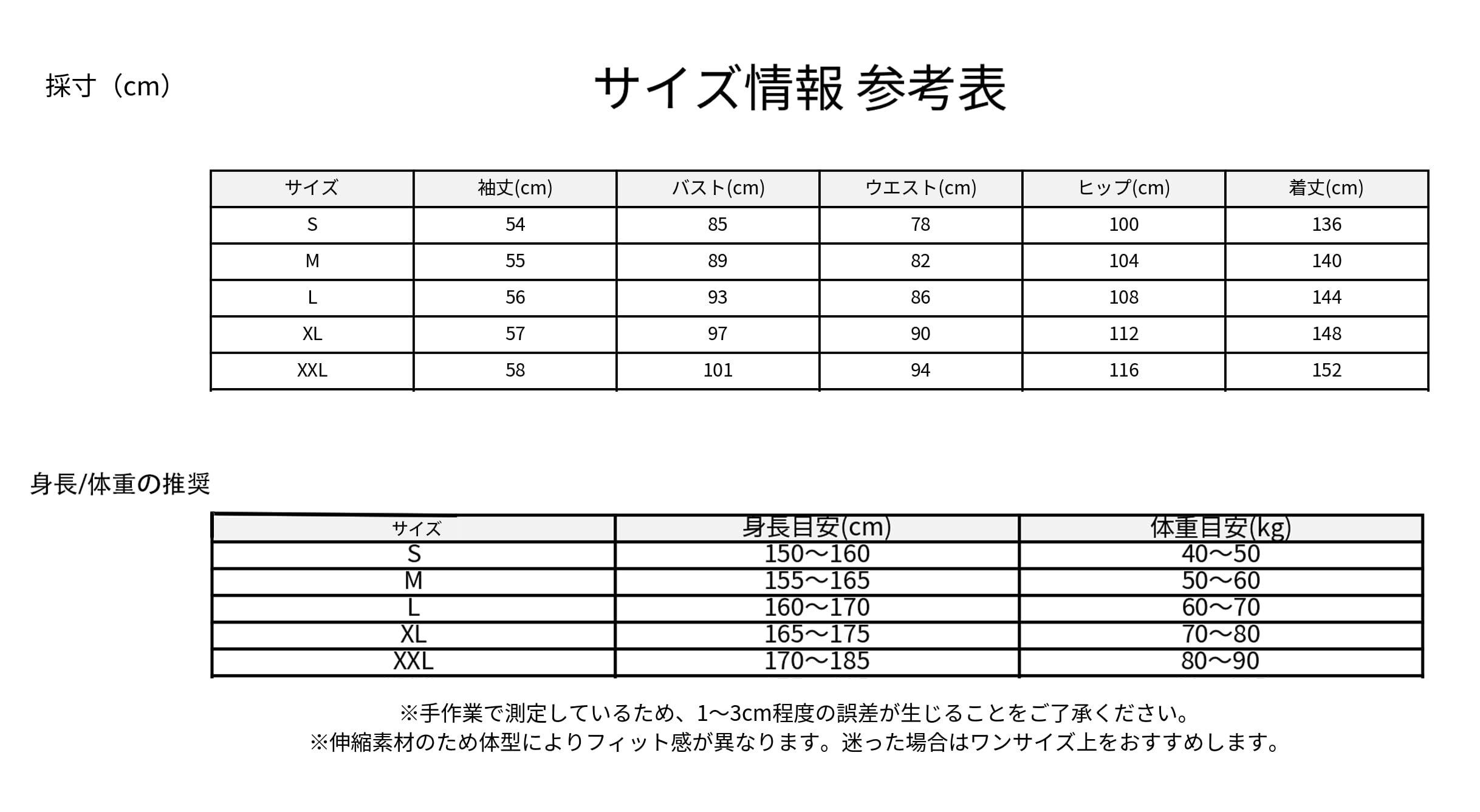 【サイズS〜XXL|サイズ表&身長体重目安で選びやすい】:S〜XXLのサイズ展開。バスト/ウエスト/ヒップ/着丈/袖丈の採寸表に加え、身長・体重の目安も掲載(※伸縮素材のため体型によりフィット感が異なります)。