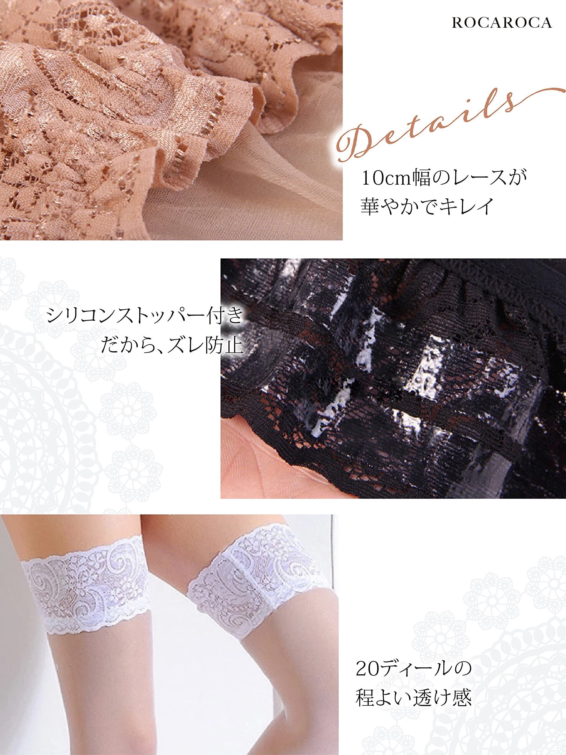シリコンストッパー付でガーターベルトなしで着用する事ができます。レース部分は、10㎝でキレイでセクシーなストッキングです。