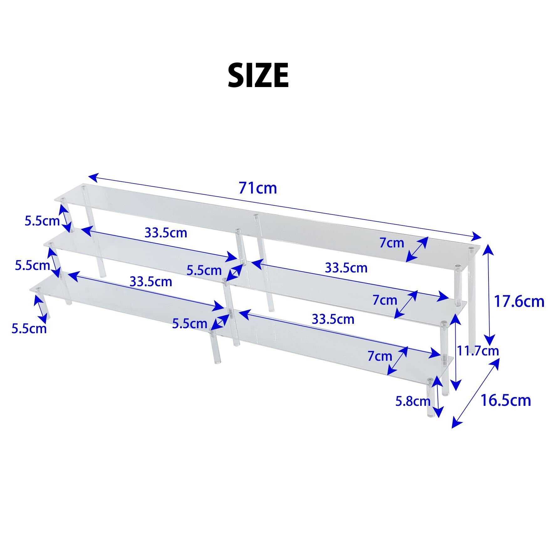 【サイズ】外寸:幅71cm 奥行16.5cm 高さ17.6cm(上段高さ:17.6cm、中段高さ:11.7cm、下段高さ:5.8cm) 【耐荷重】各棚支柱間0.4kg 【材質】アクリル樹脂 【原産国】中国 【梱包サイズ】幅71.5cm 奥行7.5cm 高さ3cm