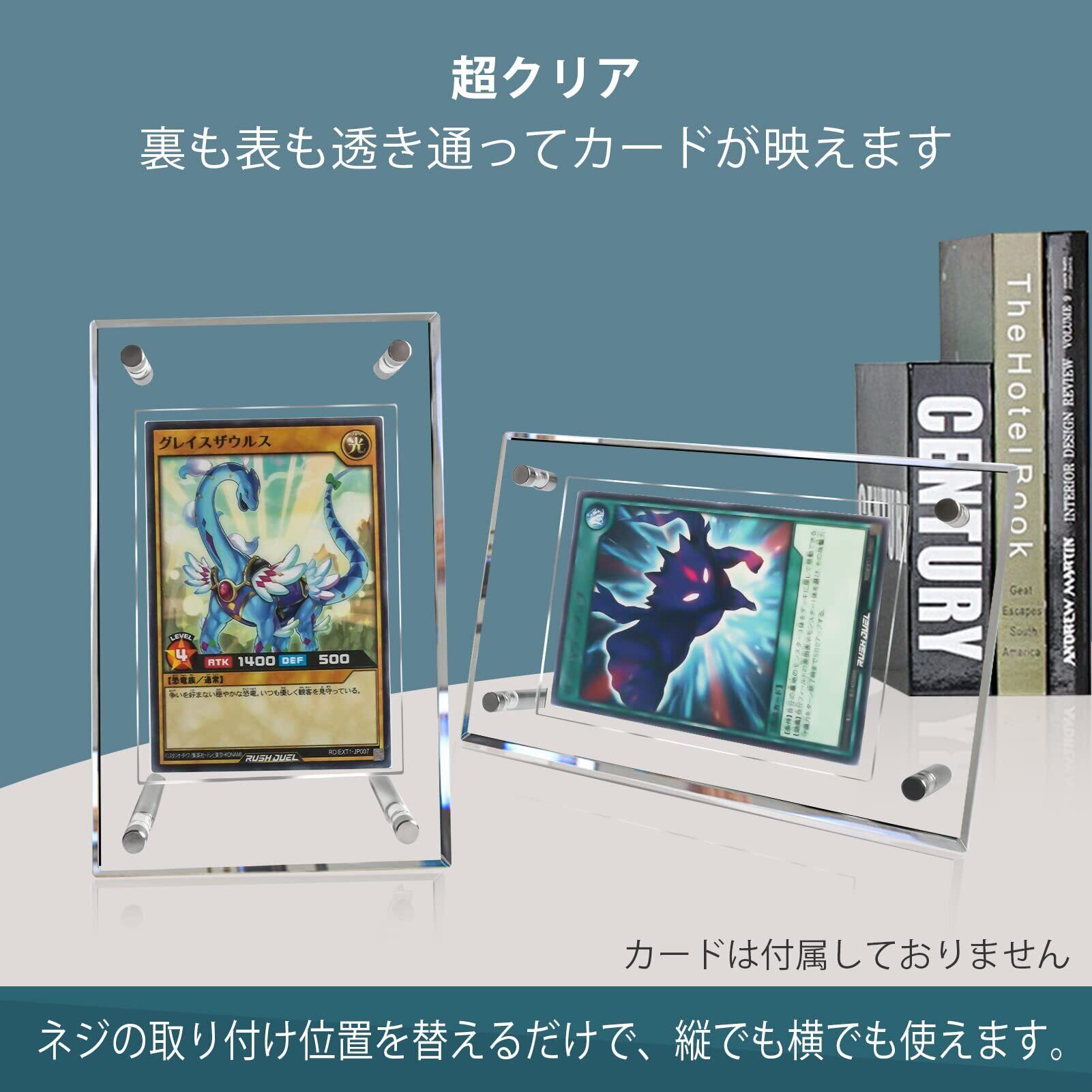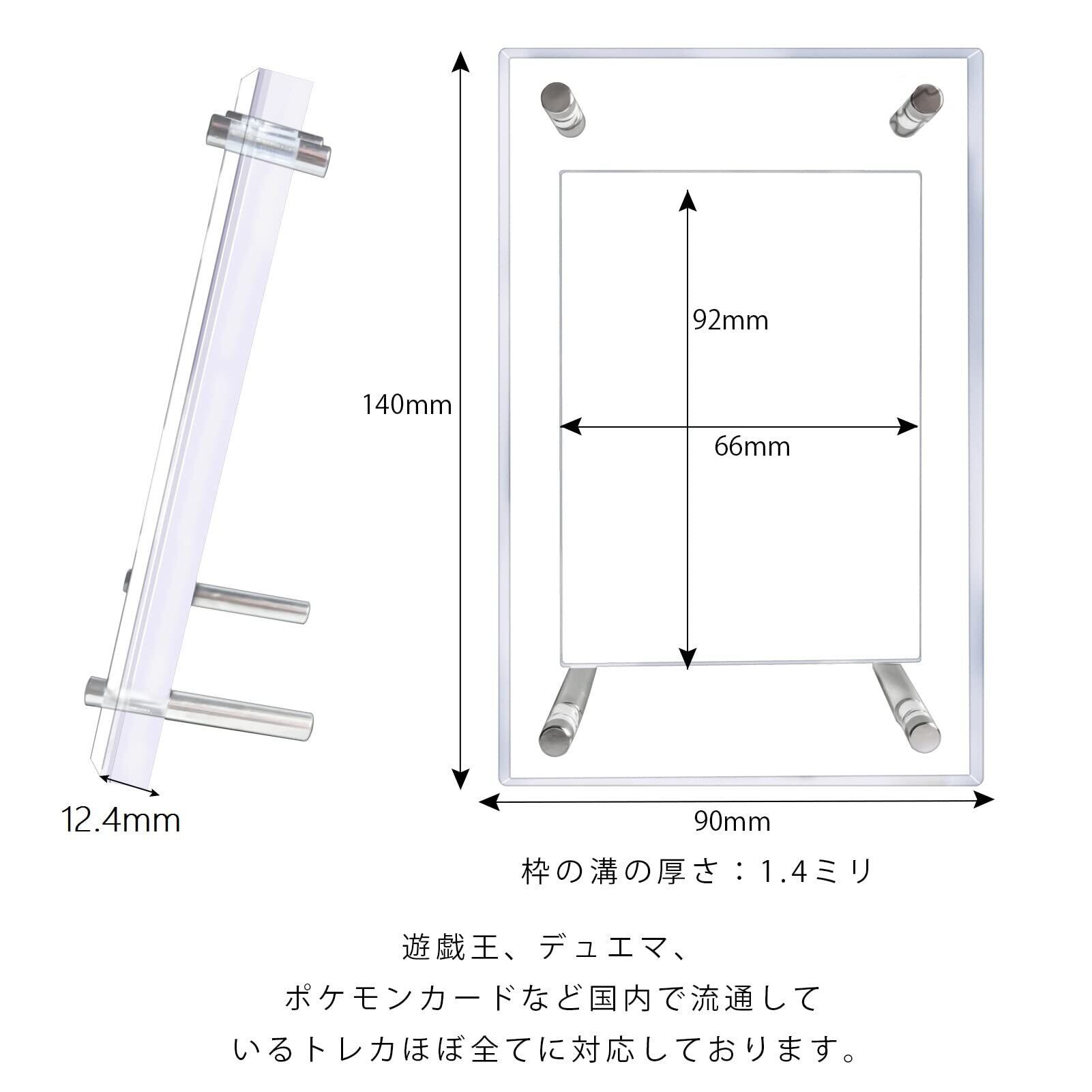 お気に入りのトレーディングカードなどはファイルやスリーブに入れておくと曲がってしまうことがあります。でも、額に入れたら裏側は見られない……そんな悩みを解決できるフレームです。 ポケモンカード、遊戯王、ポケカ、デュエマ、トレーディングカード等の大切なコレクションを守り、 安心して保管できるスタンド付きディスプレイケースです。 好きなイラストをプリントして入れたり、写真や名刺でもお店の宣伝でも、色々と使い道があります、大きさをしっかり把握して購入をお勧めします。