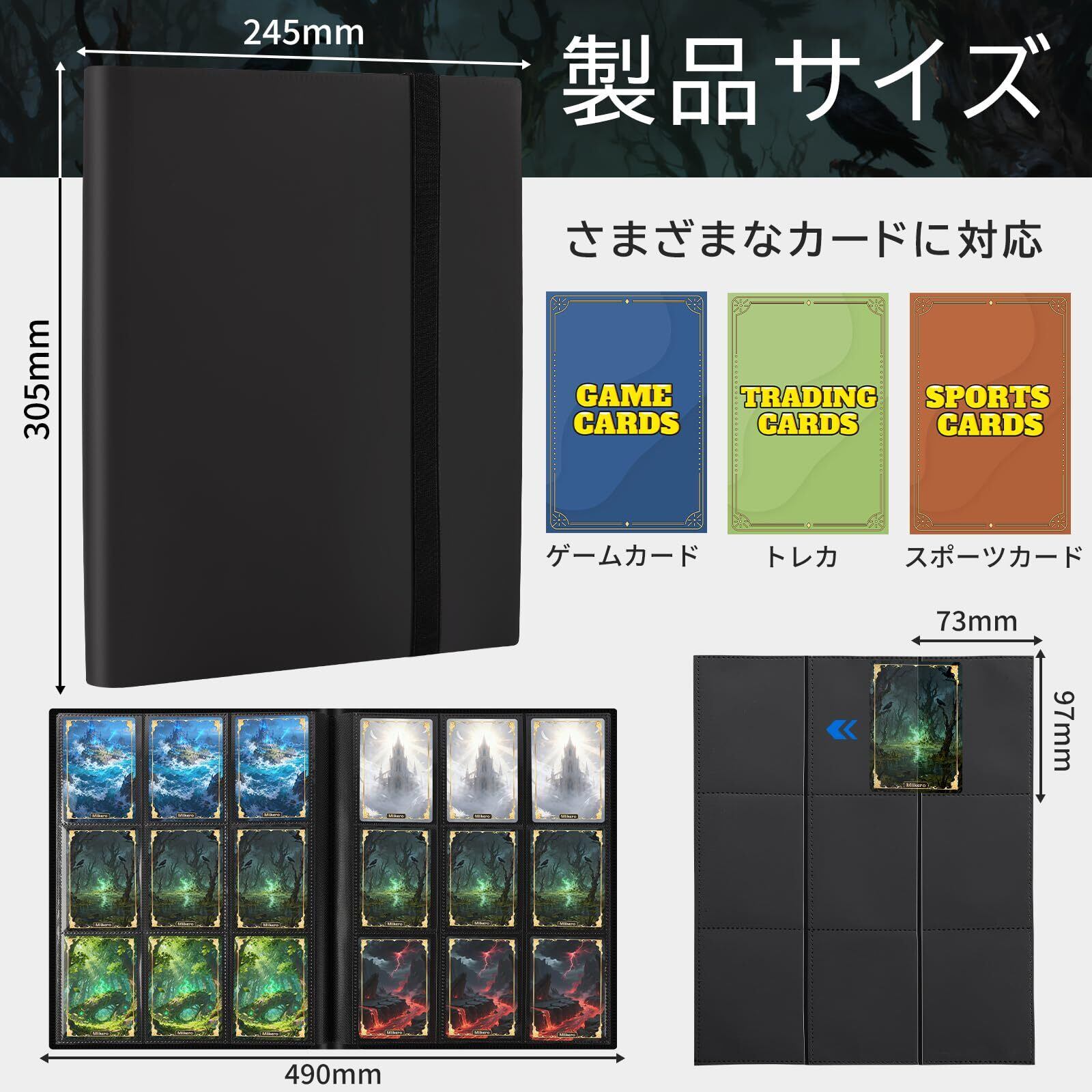 【サイズ・容量】カードファイル全体のサイズは 30.5×24.5×1.5cm で、内部のカードポケット 1 つのサイズは 7.0×9.6cm です。1 ページに 9 つのカードポケットがあり、360 枚のカードを収容可能です