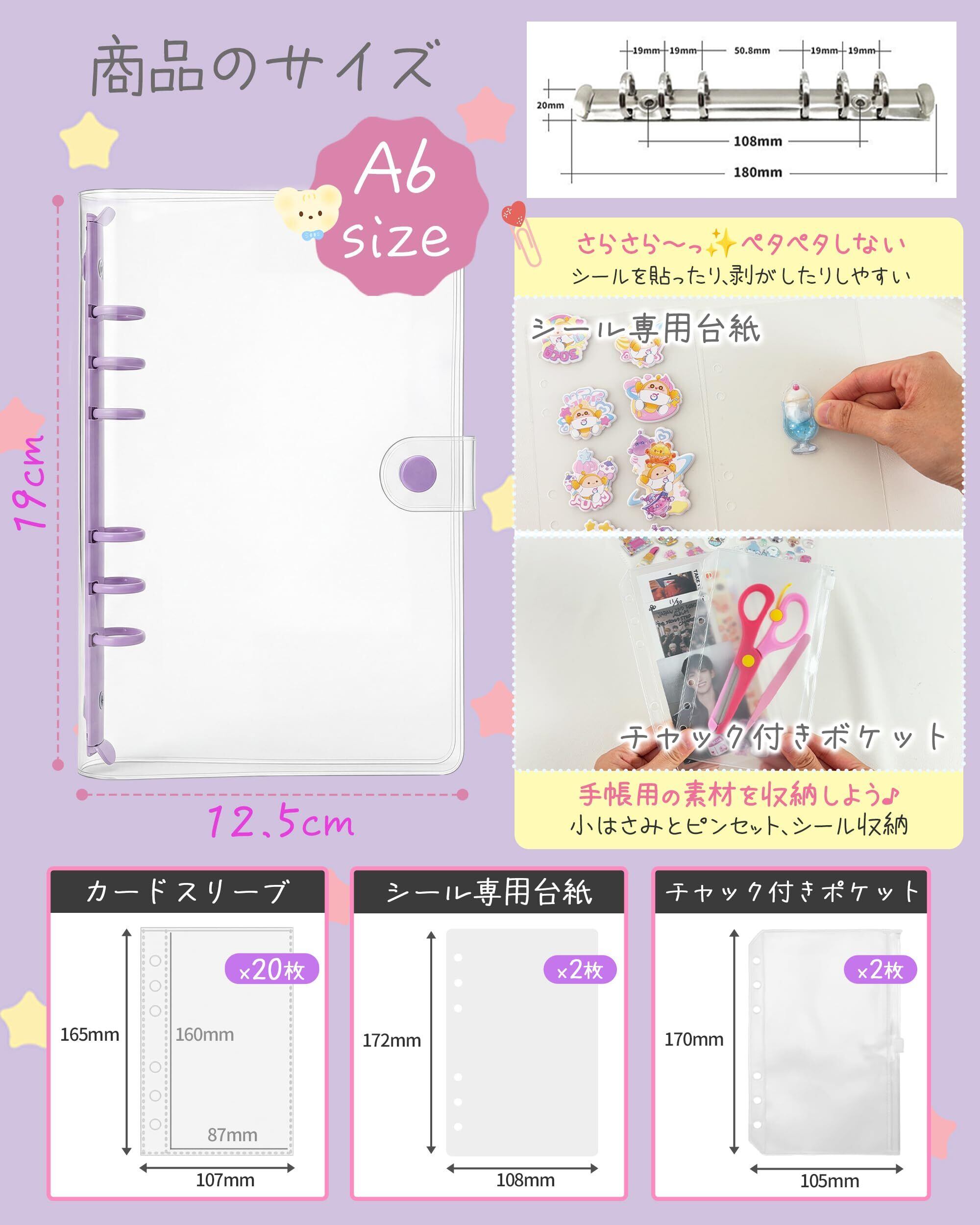 【A6サイズ シール帳バインダー】 A6サイズ、バインダー:(約)20cm×14cm、内寸約16.8cm×8.7cmのカードスリーブで、各種トレカや写真をしっかり収納、バインダーに穴のないカードや写真を追加できます。横幅を広めに設計しており、リフィルやカードがはみ出しません。アルバム感覚で楽しめるため、見返すたびにワクワクが募り、シールの収集や交換を存分にお楽しみいただけます。
