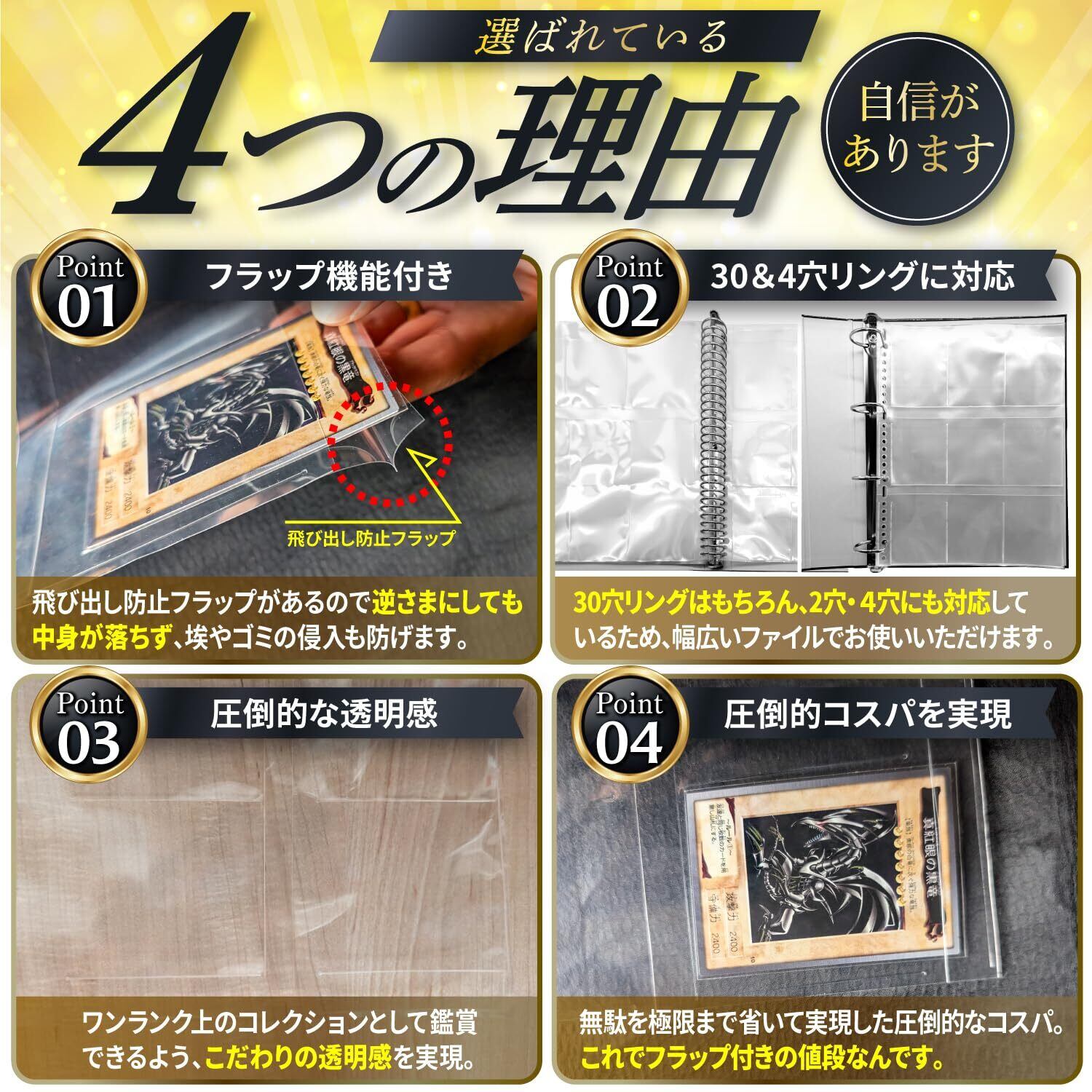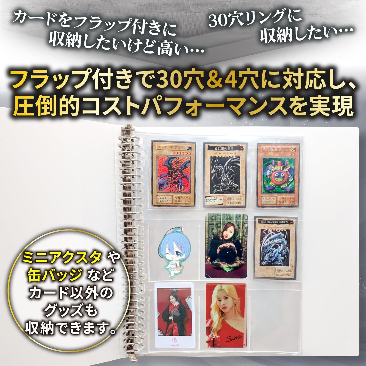 【トレカやカードゲームの収納に】容量・透明度にこだわり抜いたフラップ付き9ポケットリフィル!コレクションをしっかり保護しつつも、コレクションカードがより一層美しく鑑賞できる+お財布に優しいと大人気です大切なコレクションを高透明なファイル越しにクリアに眺められちゃいます!程よい厚みとコシもあるのでめくりやすいですよ!多くのバインダーと互換性のある30穴タイプ(2穴、4穴リング対応)の9ポケットシートなので、様々なバインダーでお使いいただけます