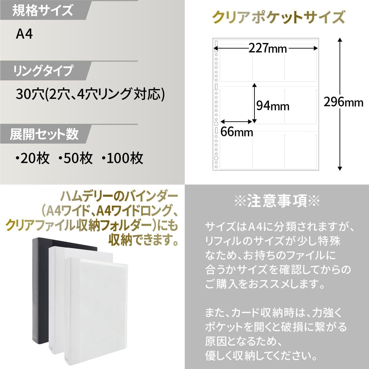 【サイズ】縦 296mm × 横 227mm /【収納サイズ】1ポケットあたり、縦 94mm × 横 66mm /【展開セット数】10枚 / 20枚 / 50枚 / 100枚 /【タイプ】30穴(2穴、4穴)リング対応