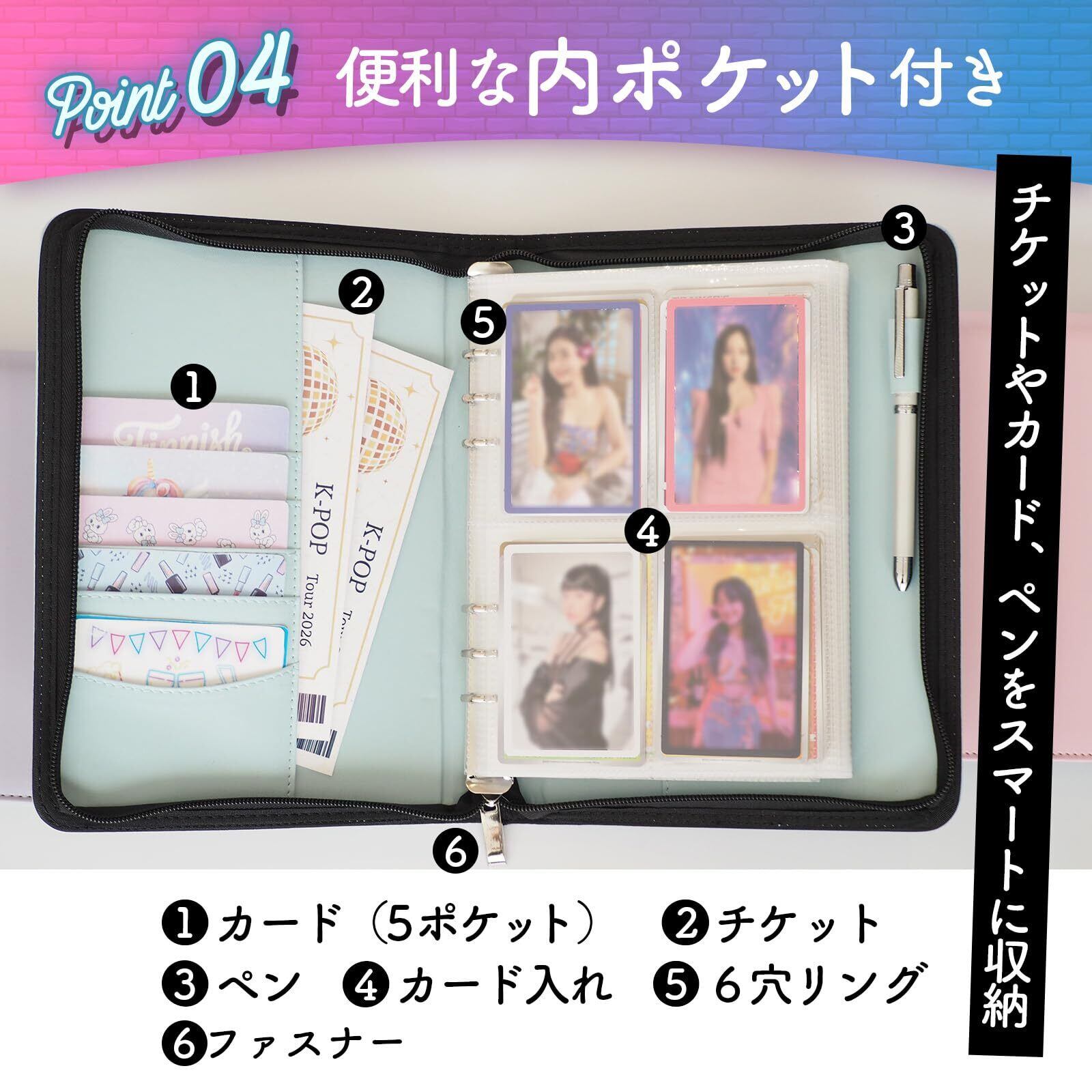 【マルチポケット】内側には便利なポケットを搭載。カード(5ポケット)やチケット、ペンなどをスマートに収納できます。トレカ以外にも小物がまとめられるので、整理整頓に役立ちます。外出先でも活躍する多機能バインダーです。