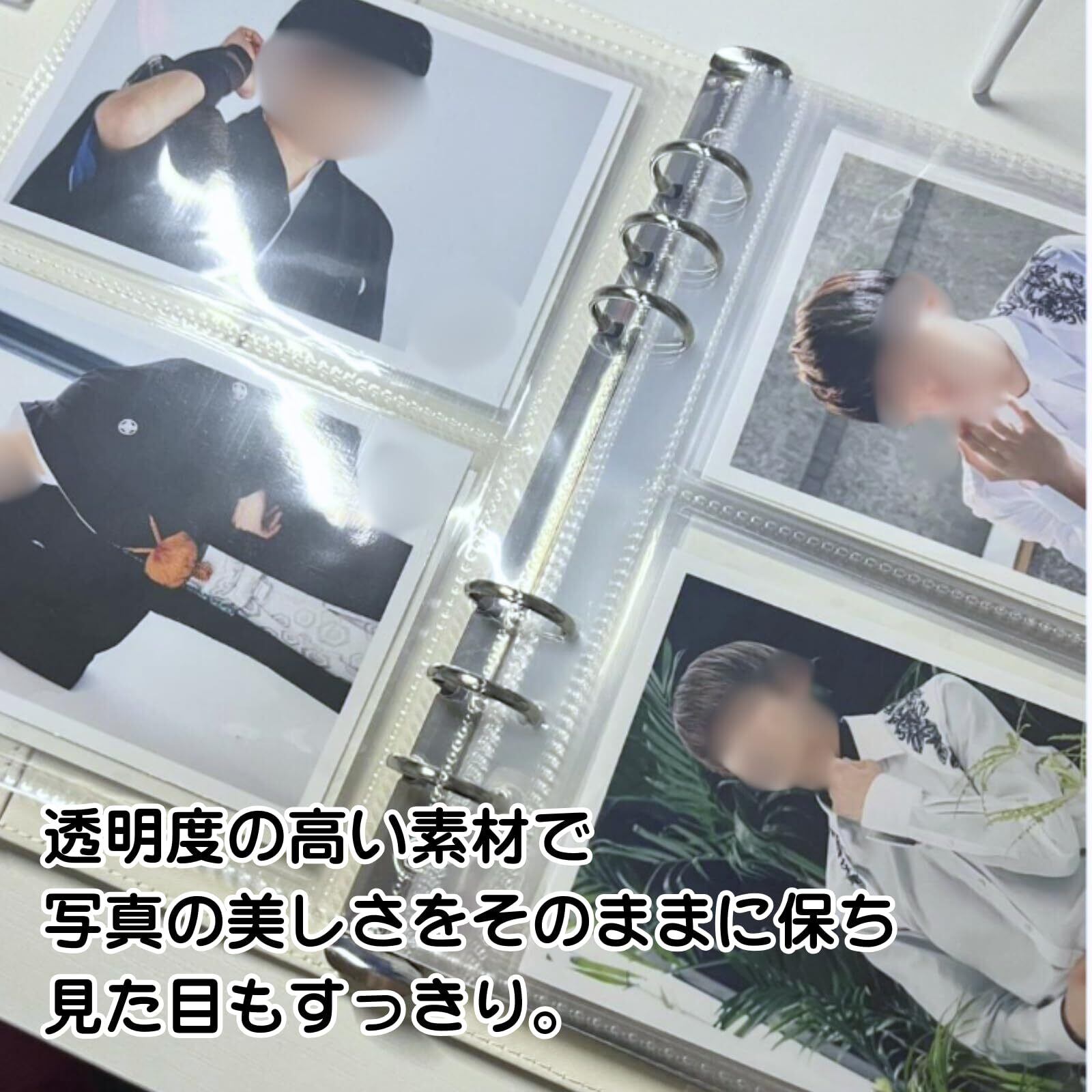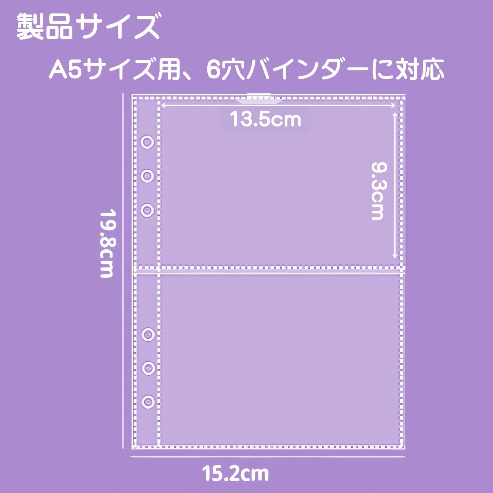 【ポイント①2ポケット構造で整理しやすい】1枚につき上下に2つのポケットが付いており、L判写真やシール、アクスタ、ミニカードなどを種類ごとに分けて収納可能。中身が重ならず、見た目もすっきり整います。【ポイント②高透明クリア素材で中身が映える】透明度の高いPVC素材を使用しているため、収納したアイテムがくっきりと見えるのが特長。推しグッズやお気に入りの写真の色味やディテールもそのまま楽しめます。【ポイント③A5サイズ&6穴バインダー対応で使いやすい】一般的なA5サイズの6穴バインダーに対応しており、入れ替え・並べ替えも自由自在。持ち運びにも適しており、イベントやカフェでの“見せる収納”にも活躍します。【ポイント④幅広い用途に対応】写真だけでなく、アクリルスタンド、ポストカード、チェキ、トレカ、紙もの、ステッカーなど様々なアイテムに対応。推し活・クラフト・日記など多用途に使えます。【ポイント⑤10枚セットでたっぷり収納!】 1セットに10枚入りで、合計20ポケット分の収納スペース。コレクションがどんどん増えても安心。お得なまとめ買いにも最適です。
