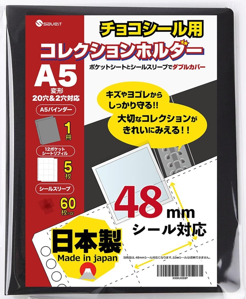 【プラスチック製だから水や汚れに強い!】 紙製のバインダーのさまざまな問題を解決するために、PP製のバインダー(ファイル)が最適と判断し、今回採用しました。PP製ファイルですと紙製と比較して汚れも付きにくく、角や端もほつれにくいので、大切なコレクションを守るためには最適な材質と言えることでしょう。大切なシールが「汚れにくい」「曲がりにくい」「そのまま保存」に最適なバインダーです。 【商品サイズ】 当商品は、48㎜シール専用となります。52㎜のシールは使用できませんので予めご了承ください。サイズが不明な場合には必ずご購入前にご自身のシールの長さを計ってお確かめください。サイズ・・・バインダー:縦236mm×横190mm 背幅25㎜・12ポケットシート:縦219mm×横175mm(20穴&2穴対応)・シールスリーブ:縦50mm×横50mm