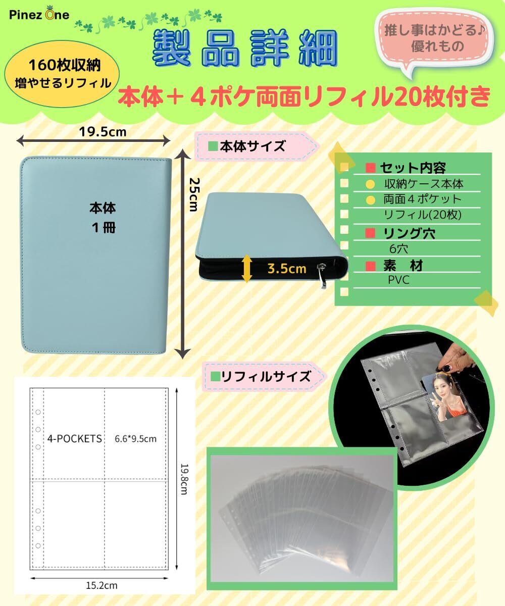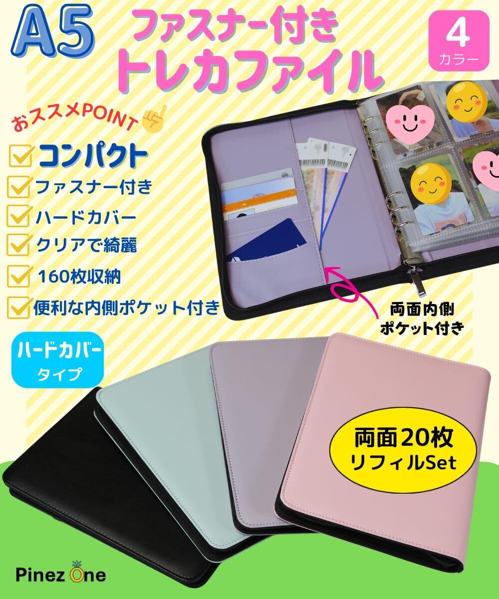 PinezOne A5 トレカ ファイル ケース 推し活 収納 バインダー ファスナー付き 両面 リフィル 20枚セット 160枚 収納 リフィル 追加可能 (アイスブルー, A5)