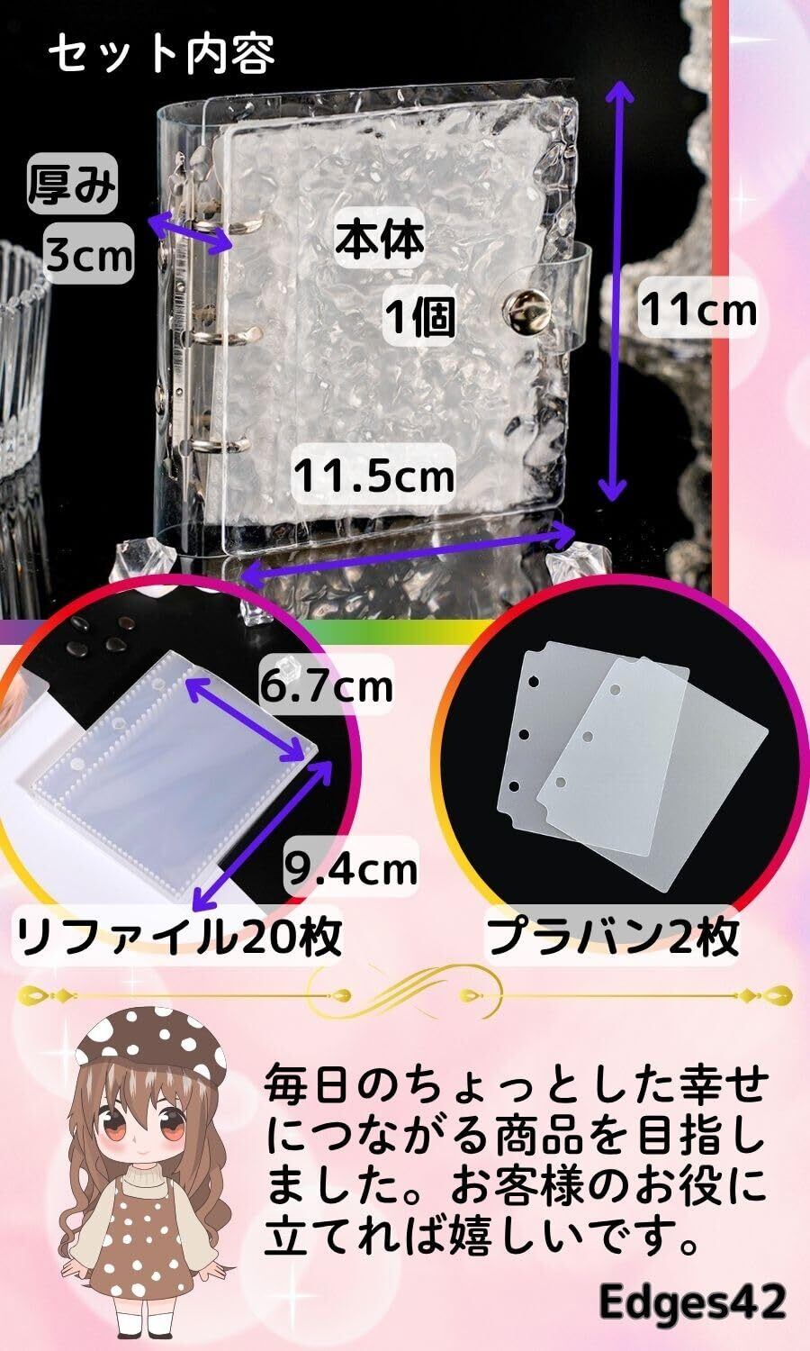 【サイズ・セット内容】たて11cm 横11.5cm 厚さ3cm。付属品リファイル20枚 プラバン2枚。