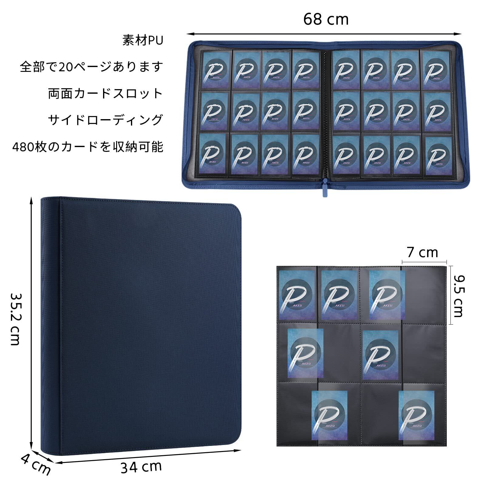 PAKESI 12ポケットトレーディングカードアルバム480収納インナページカードPUカード収納両面側装着PP他カード(青)