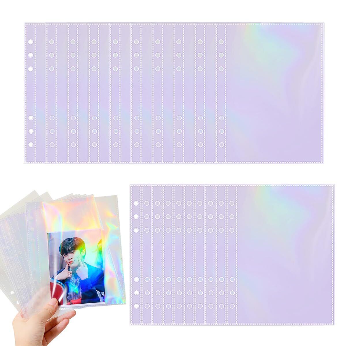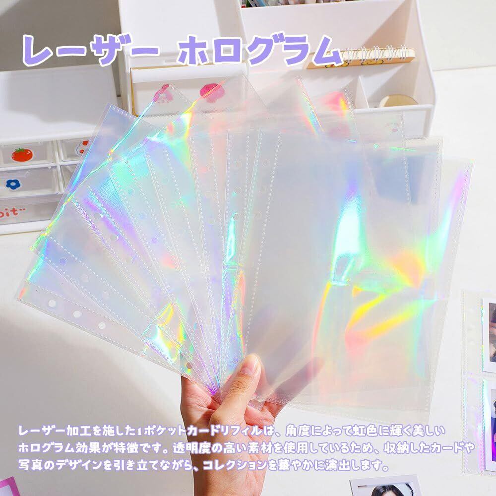 3.【レーザー ホログラム】镭射(レーザー)加工を施した1ポケットカードリフィルは、角度によって虹色に輝く美しいホログラム効果が特徴です。透明度の高い素材を使用しているため、収納したカードや写真のデザインを引き立てながら、コレクションを華やかに演出します。