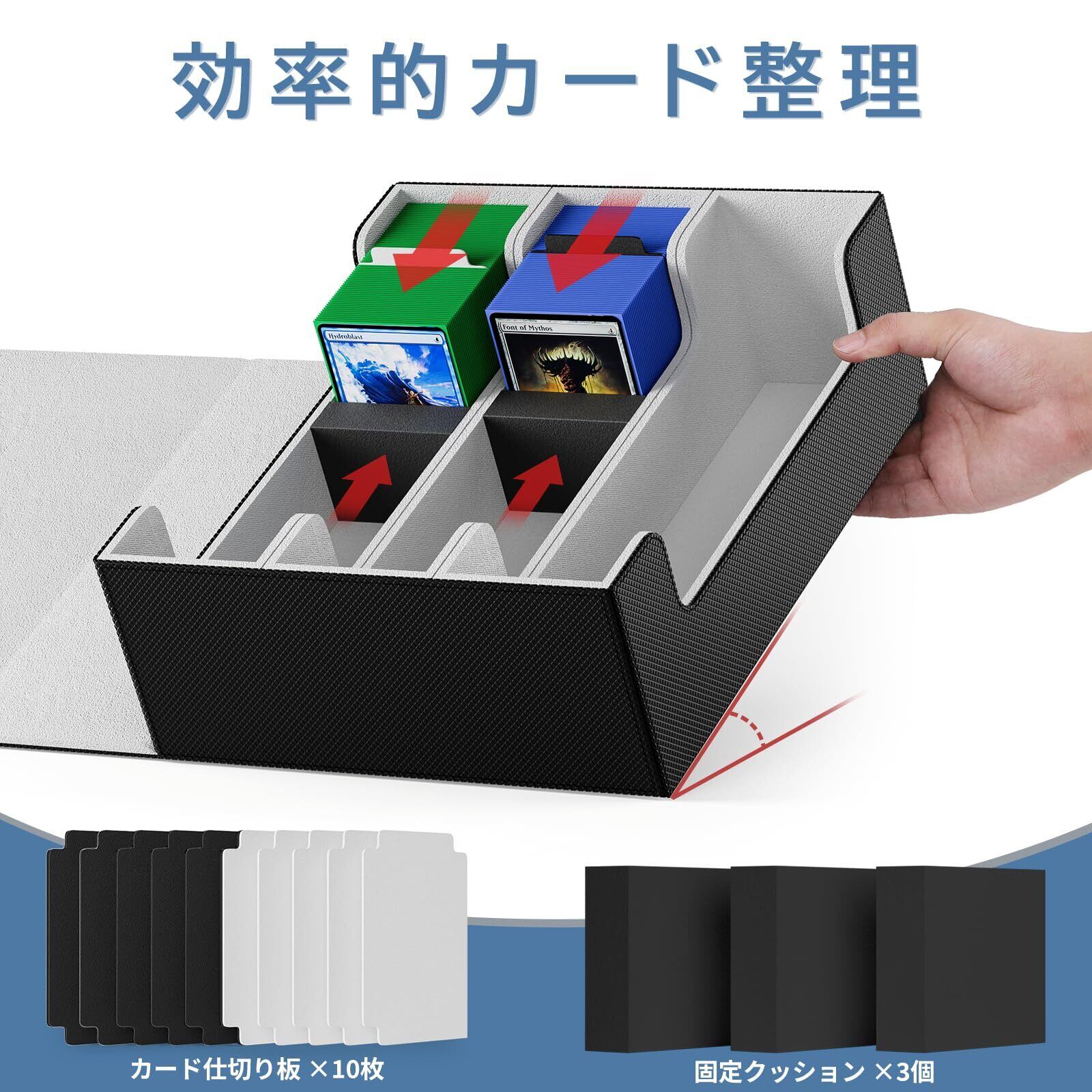 【大容量の設計】大容量のデッキケースは、1800 枚以上の単体のカード、1100 枚以上のダブルセットのカード、2400 枚以上のカバーのないカードを簡単に収納することができます。