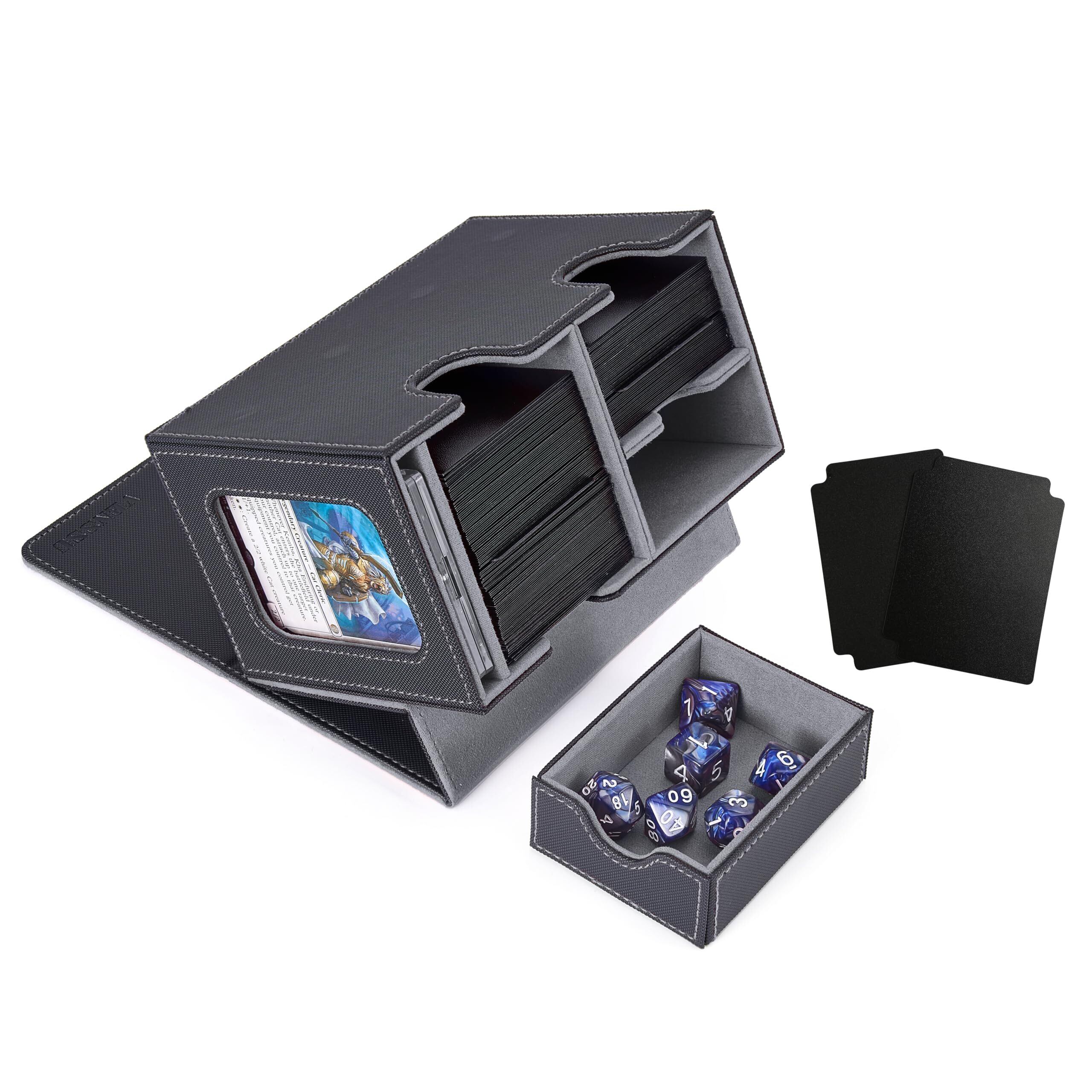 Venssu デッキケース トレカケース カードディスプレイウィンドウ ダイス入れ 200枚収納 仕切り板2つとマグネットローダー1つ付きスリーブ対応 (黒内装灰)