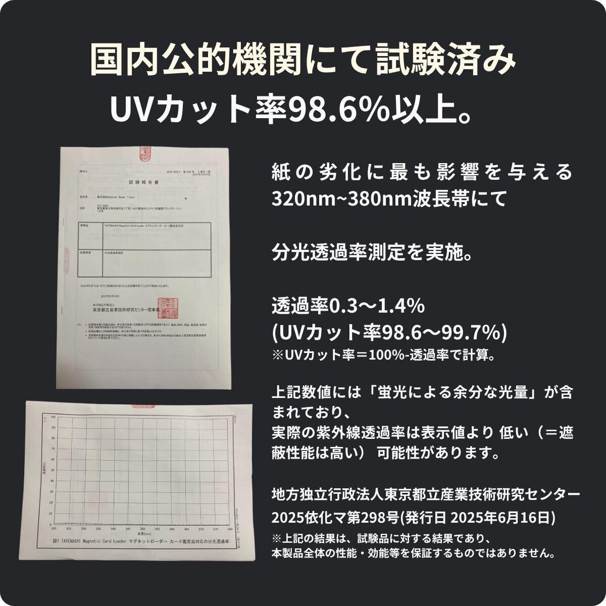 【UVカット&ウルトラクリア仕様】透明部分には98.6%以上のUVカット機能付きのクリア素材を採用。日焼けや色あせを抑え、カードの美しさを長く保ちます。室内展示や保管を想定した仕様で、光に弱いカードでも安心感が高まります。国内第三者機関にて正式に試験をおこないました。