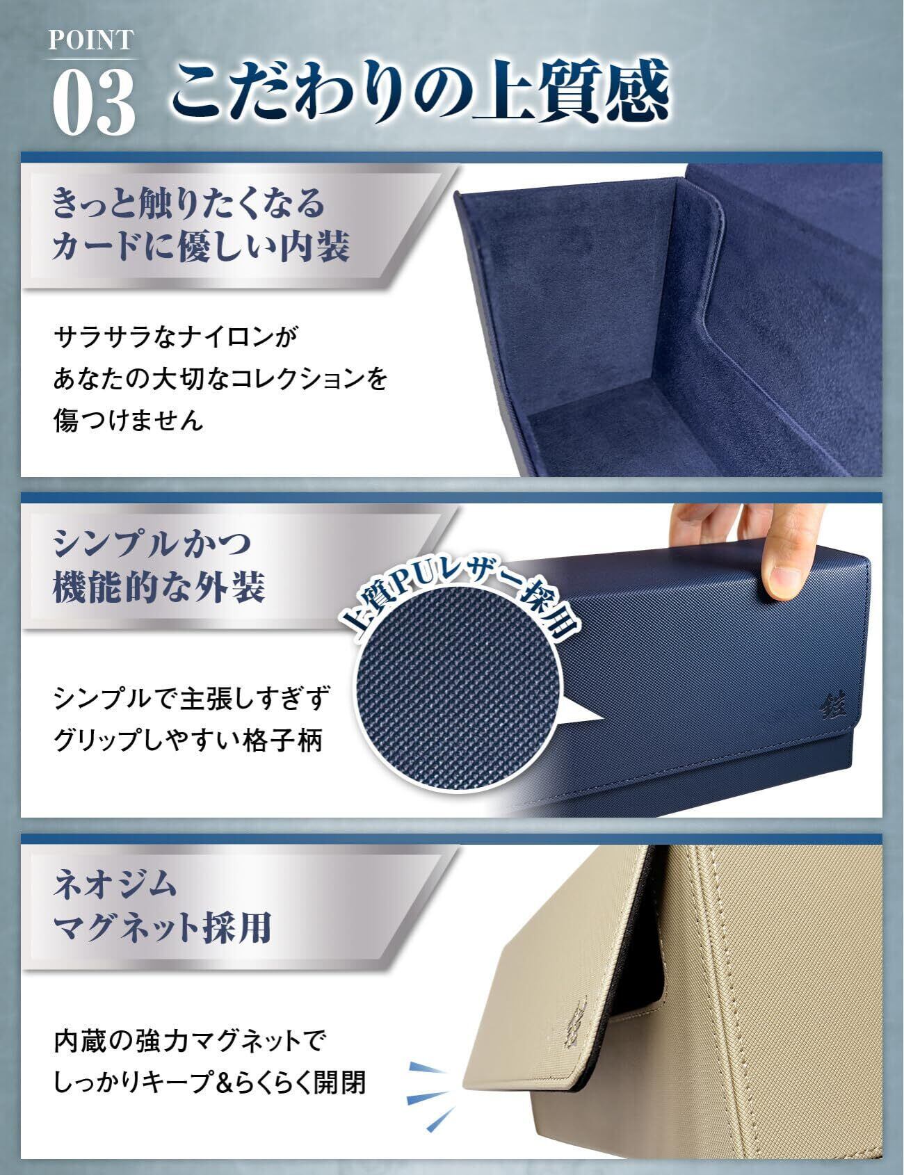 特徴1【オリジナルカラー】・ TCG ファン300名によるアンケートを実施 クールなネイビーブルー、大人なナチュラルベージュ、定番ブラックシリーズからお好みでお選びいただけます。__特徴2【マルチな使い方】・一般的なデッキケースより少し大きめ設計で マグネットローダー も収納可能。複数のデッキケースやカードの持ち運びにも上質なストレージとしてご使用いただけます。__特徴3【こだわりの上質感】・上質素材を使いながら[2層構造]でとってもタフ、重ねての収納にもおすすめです。