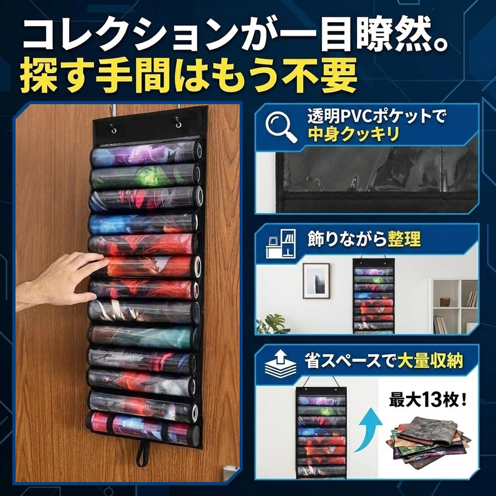 【TCG向けのサイズ設計】 40×100cm(13段)・40×60cm(7段)の2タイプを用意し、ポケカ・遊戯王・MTGなどの一般的なプレイマットサイズに対応。マットが折れたり丸まりにくいレイアウトで、保護しながら保管できます。