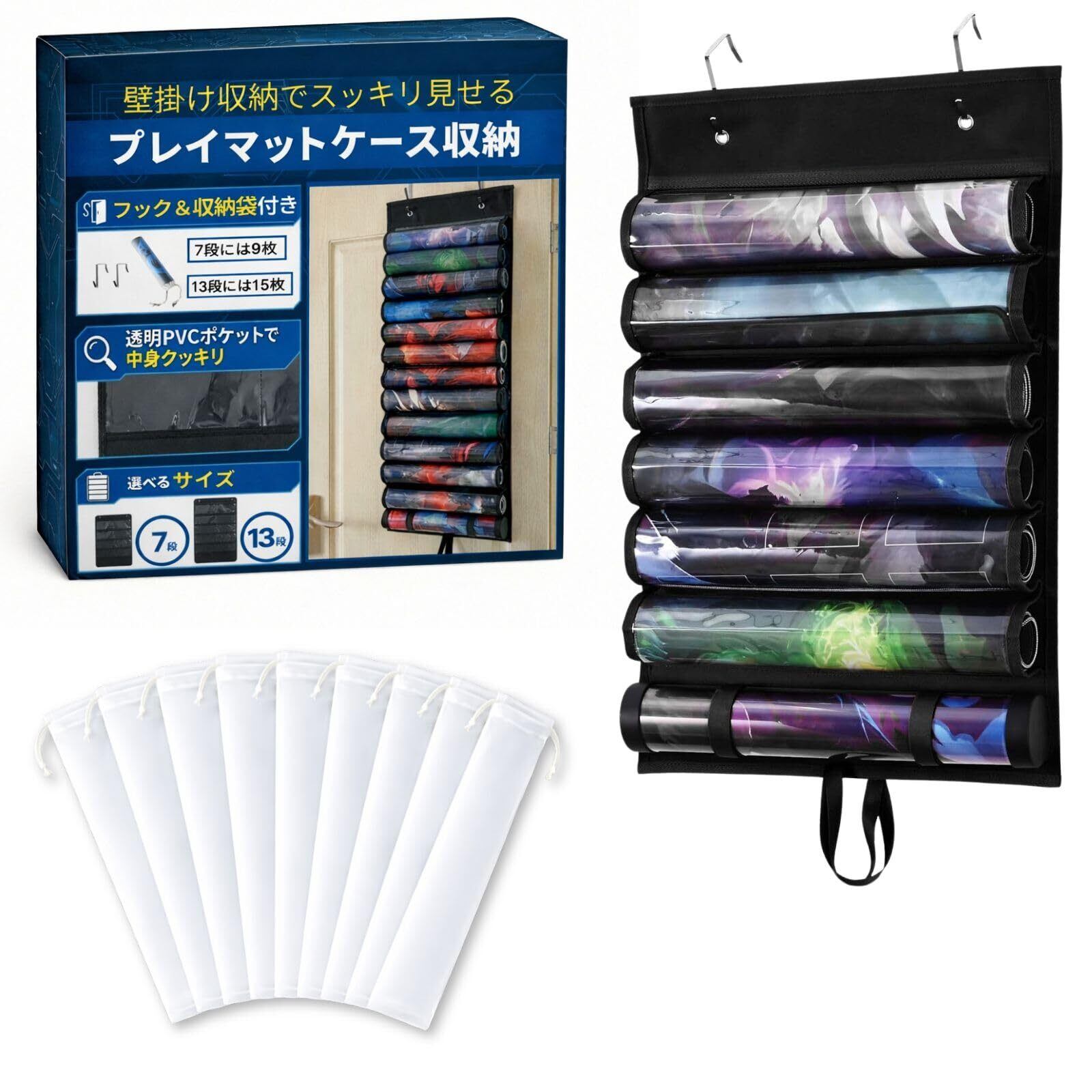 プレイマットケース 収納 吊り下げ プレイマット カバー カードゲーム プレマ 壁掛け 省スペース 収納袋付 (プレイマットケース7段 + 収納袋9枚付き)