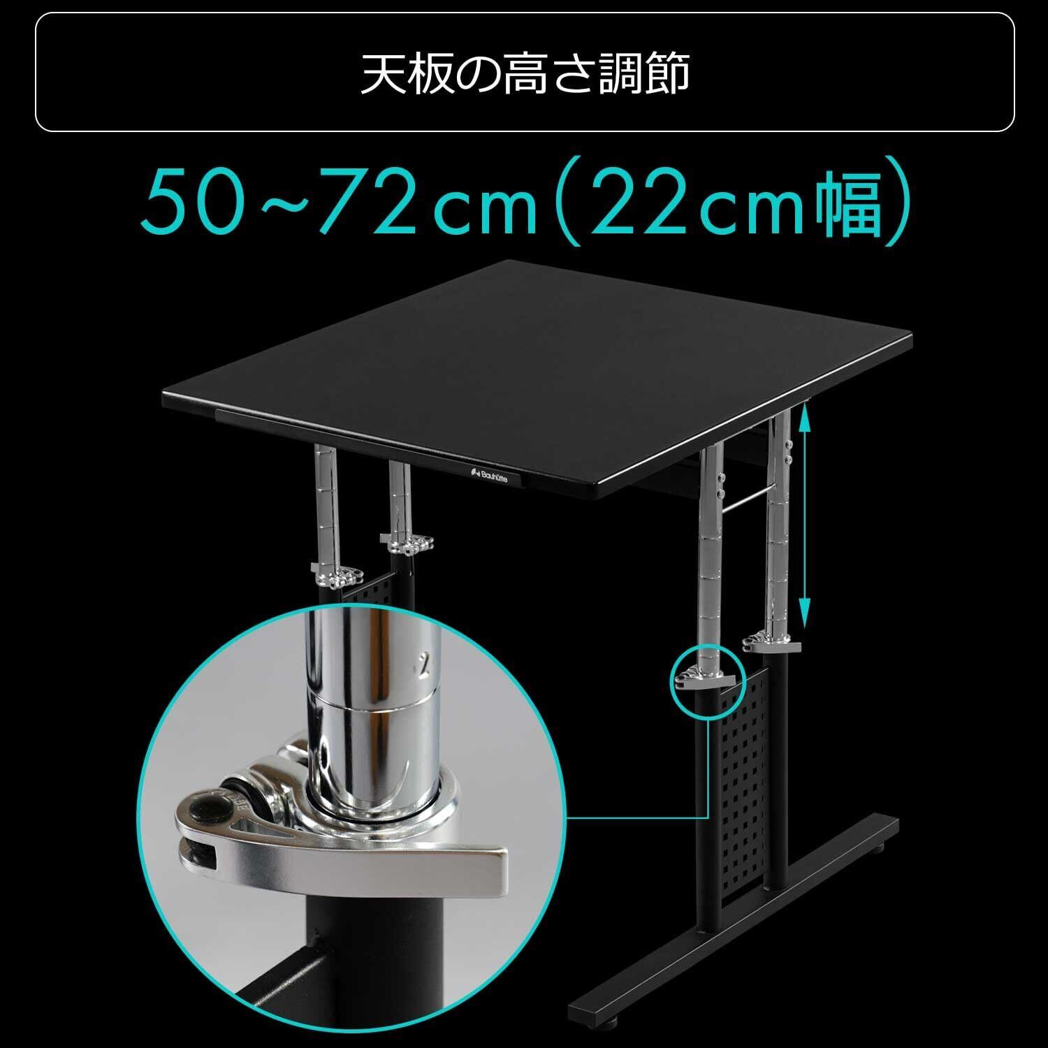 【天板の高さ調節】床から50~72cm(22cm幅)の範囲で、無段階での天板昇降が可能です。リビングでの座椅子からPCデスクでのチェアまで、あらゆるレイアウトに対応します。