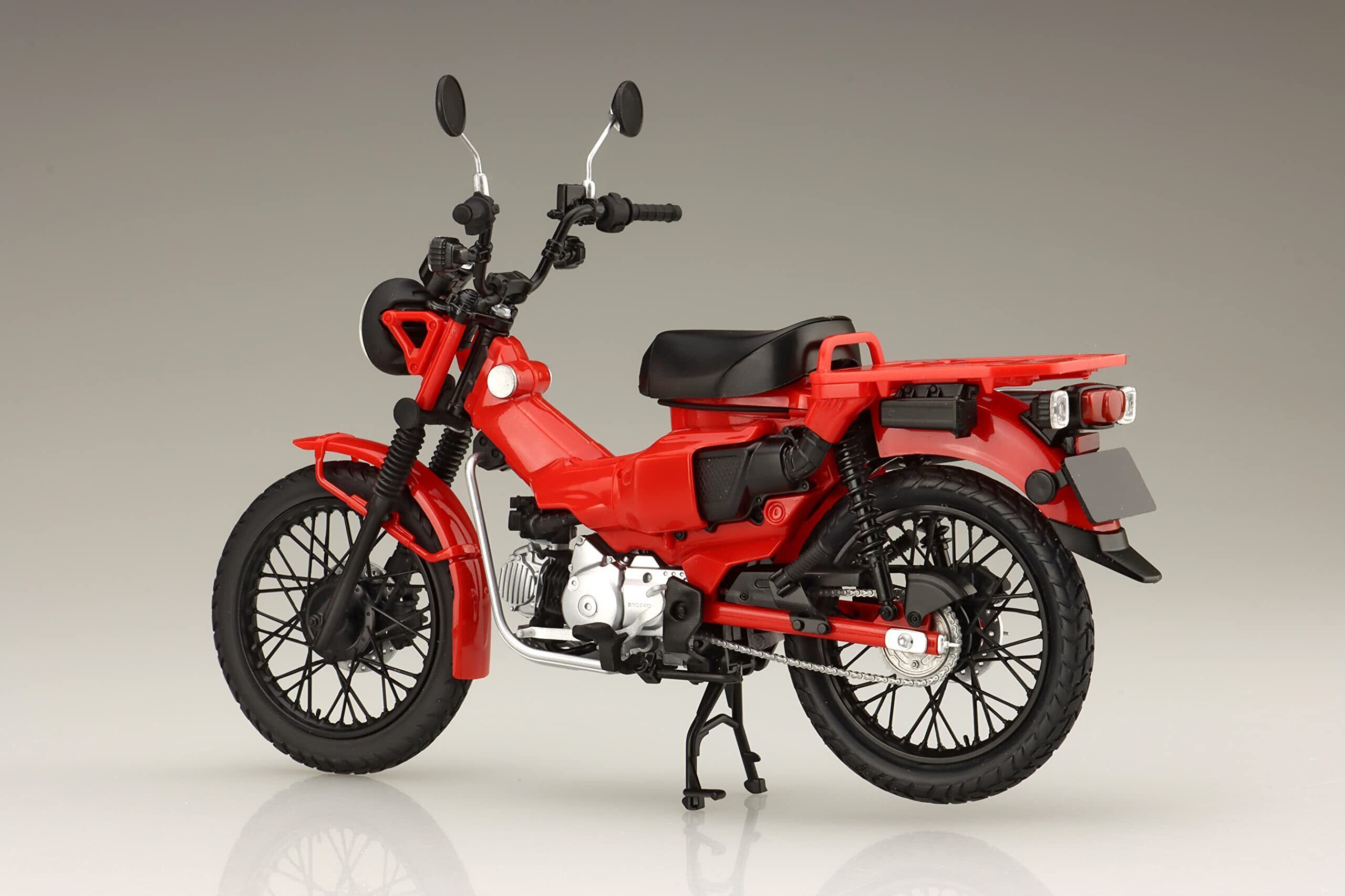 1/12スケールのスナップフィット式バイクモデルの新金型第2弾「ホンダ ハンターカブ」 製品は2020年に発売開始されたCT125ハンターカブ(グローイングレッド)をモチーフにしています。 タンデムステップを装備、マフラーカバーが装着された日本国内仕様です。 製品は組立が必要なキット形式。 1/12スケールならではの大きさにより細かな造形を的確に再現しています。 【塗装不要・接着不要】 パーツそれぞれに成型色でパーツは着色されており、ボディは塗装で得られない艶質感を実現。 パーツ同士をはめ込む設計仕様により簡単に組立てられるようになっています。 2010年代に入り初代クロスカブの登場や、2017年には現行スーパーカブがデビュー。 そしてかつてのCT110の姿を彷彿させる「CT125ハンターカブ」が2020年に登場しました。 C125に比較してやや大柄な車体に、中低速の力強い走りを得たレジャーバイクとして仕上げられ、CT110のようなマフラーや角形ウィンカーなど特徴的な造形をしています。 実車はグローイングレッドおよびマットフレスコブラウン(2021年春現在)の2色展開となっています。 ボディは専用の成型材を用いて塗装では表現が難しいレベルの艶を再現。 成型色はレッド・ブラック・シルバー・アルミ・クリア・クリアレッドの6種類で構成。 エンジン本体はブラックおよびシルバーの成型色でブロック状に組んでいく仕様。 左右にある「HONDA」の彫刻は繊細な金型彫刻で再現。 特徴的な左側後方にある吸気路は艶消しブラックとボディ色の2色で再現しています。 サイドスタンドおよびセンタースタンドは可動式。 ハンドル周囲のスイッチ類は的確に立体化し、マーキングは付属シールで再現。 メーターはカバー面に透明パーツを被せてリアルなスタイルとしています。 ハンドル中央部のウィングマークはシールで表現、右手側にあるマスターシリンダーなど細部部品まで再現。 シートは生地縫い目に合わせて3ピース構造とし、艶消しブラックの成型色としています。 シートは可動(開閉)可能。内側の給油口周辺まで立体化、タンクキャップは別パーツとして色調差も表現しています。 タンデムステップは格納と展開状態が選択でき、パーツを差し替えることで変更も可能です。 非常に目立つ特徴的な後部キャリアは、スライド金型を採用し1ピースパーツとしています。 ※この商品は日本製です。 ※この商品は、組み立てが必要なプラスチックモデルキットです。