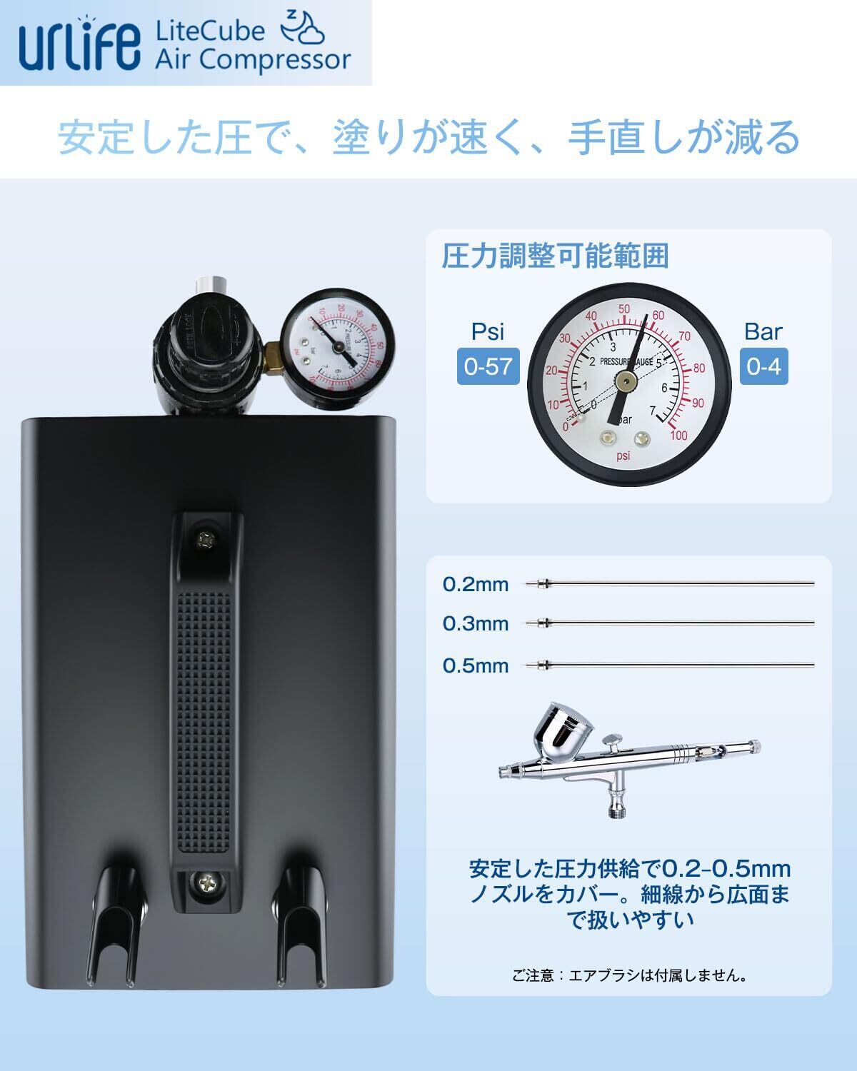 【数量限定】urlife コンプレッサー 小型 A4の半分でも 高圧域 安定供給 最大圧0.4MPa 対応 精密無段階調圧 0-57PSI 47dB 静音 吐出23-25L/min 据え置き ホビー向け LiteCube