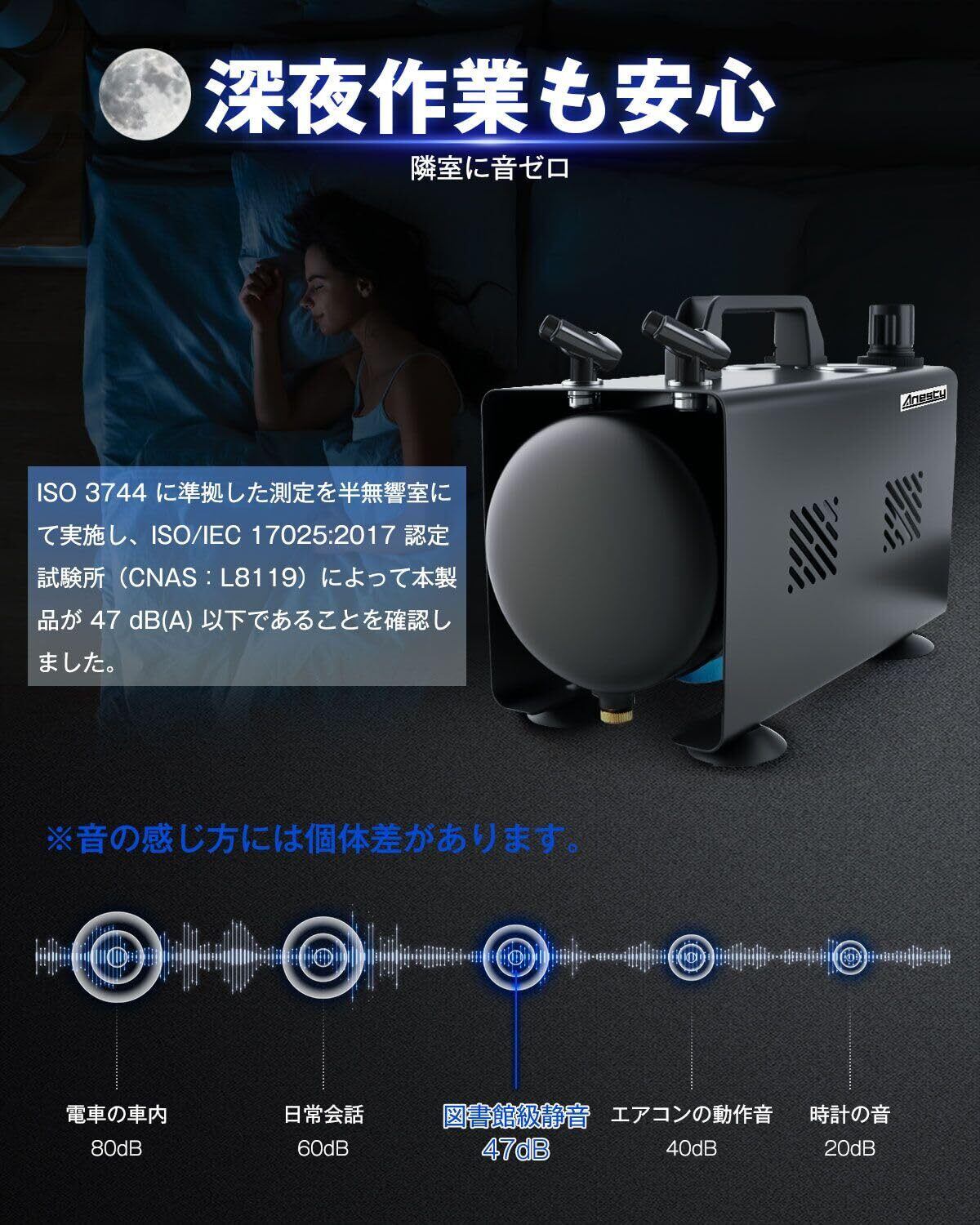 【タンク一体型×静音設計、安定したエア供給と自動ON/OFF機能】 タンク一体型構造により、脈動を抑えた安定したエア供給を実現し、長時間の吹き付けでもムラの少ない塗装が可能です。加えて、運転音は47dB未満の静音仕様で、室内作業でも周囲を気にせず使用できます。エアブラシのレバー操作に連動して自動でON/OFFするオートストップ機能付きで、無駄な連続運転を減らし、騒音・消費電力・本体への負荷を抑えます。