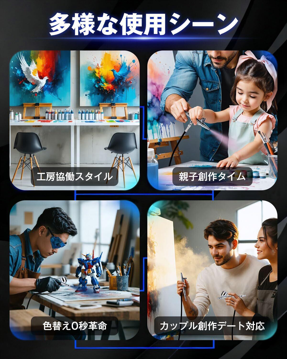 【2本常時接続でワンタッチ色替え、複数色を使う塗装に強い構成】 2本のエアブラシを常時接続しておけるため、色替えのたびにホースやハンドピースを付け替える必要がありません。ベースカラーとシャドウ、ハイライトなど複数色を使い分ける模型・プラモデル塗装に適しており、作業の中断やセッティング変更を最小限に抑えられます。