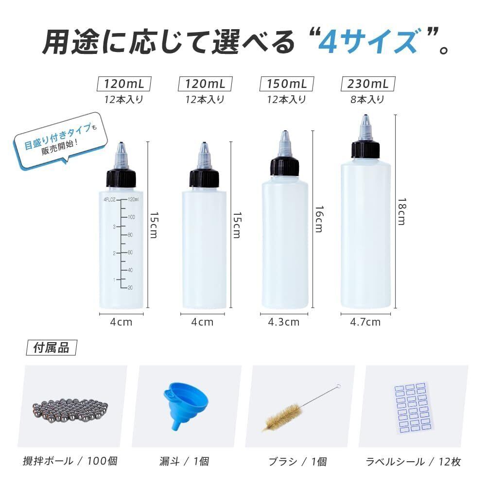 ドロッパーボトルは120mL、150mL、230mLの3サイズから選択可能で用途に合わせてお選びいただけます。