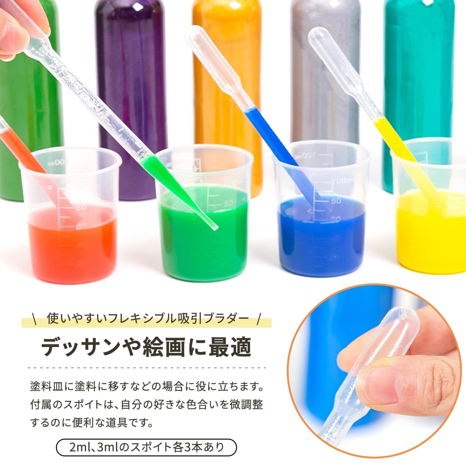 ✨【付属工具】高精度スポイトセット:2mlサイズと3mlサイズのスポイトを各3本ずつ、合計6本を同梱。正確な塗料の計量が可能で、色の微調整や混色作業をサポートします。少量の塗料も無駄なく使用できます。
