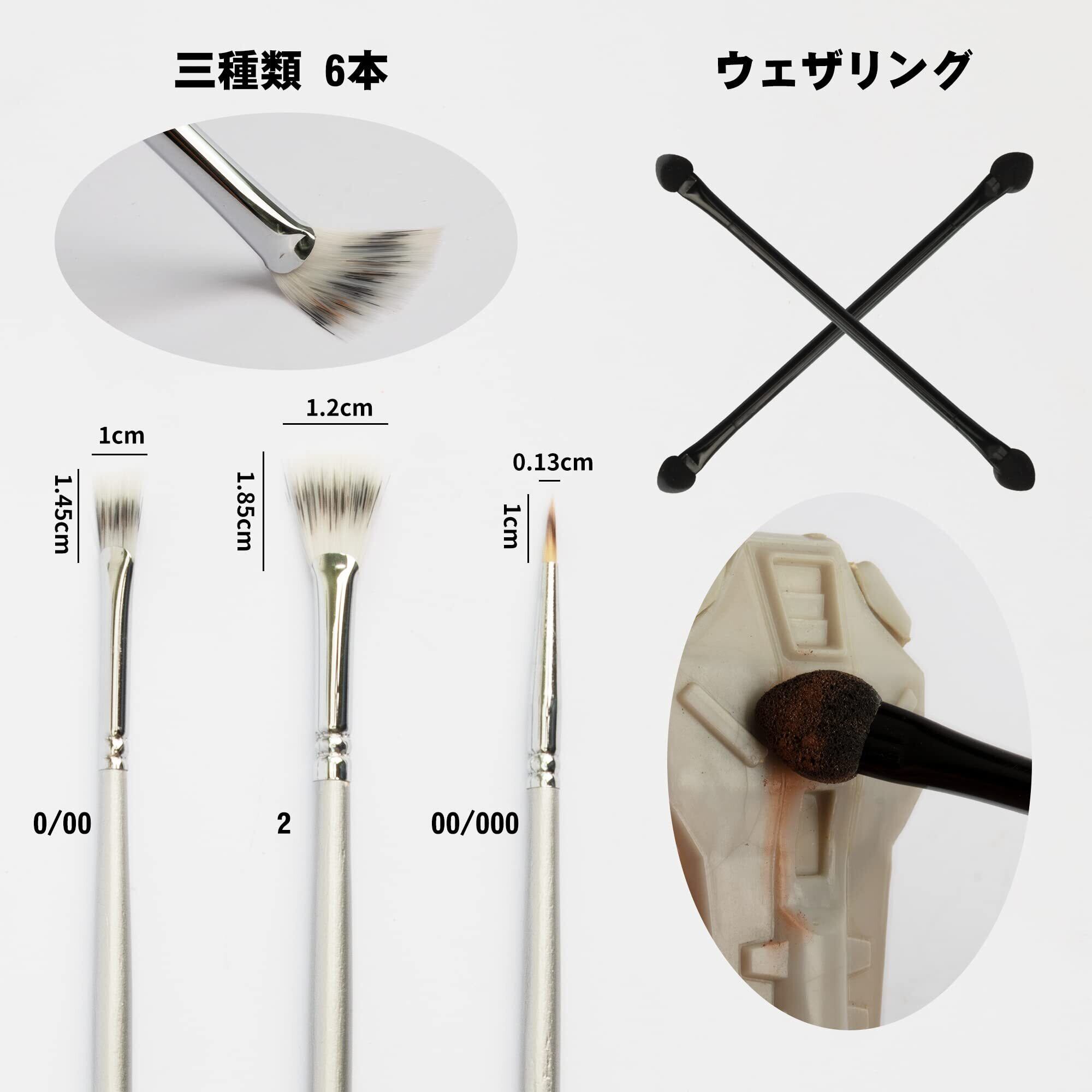 塗装筆:高品質の素材を採用され、三種類の毛先の塗装筆がセットになっています。毛先は細いのと太いのが揃いて目的に応じて使い分けできます。 スポンジ筆:12cm ウェザリング用に最適、「汚れ」、「風化」などの汚し塗装を完璧に現れます。