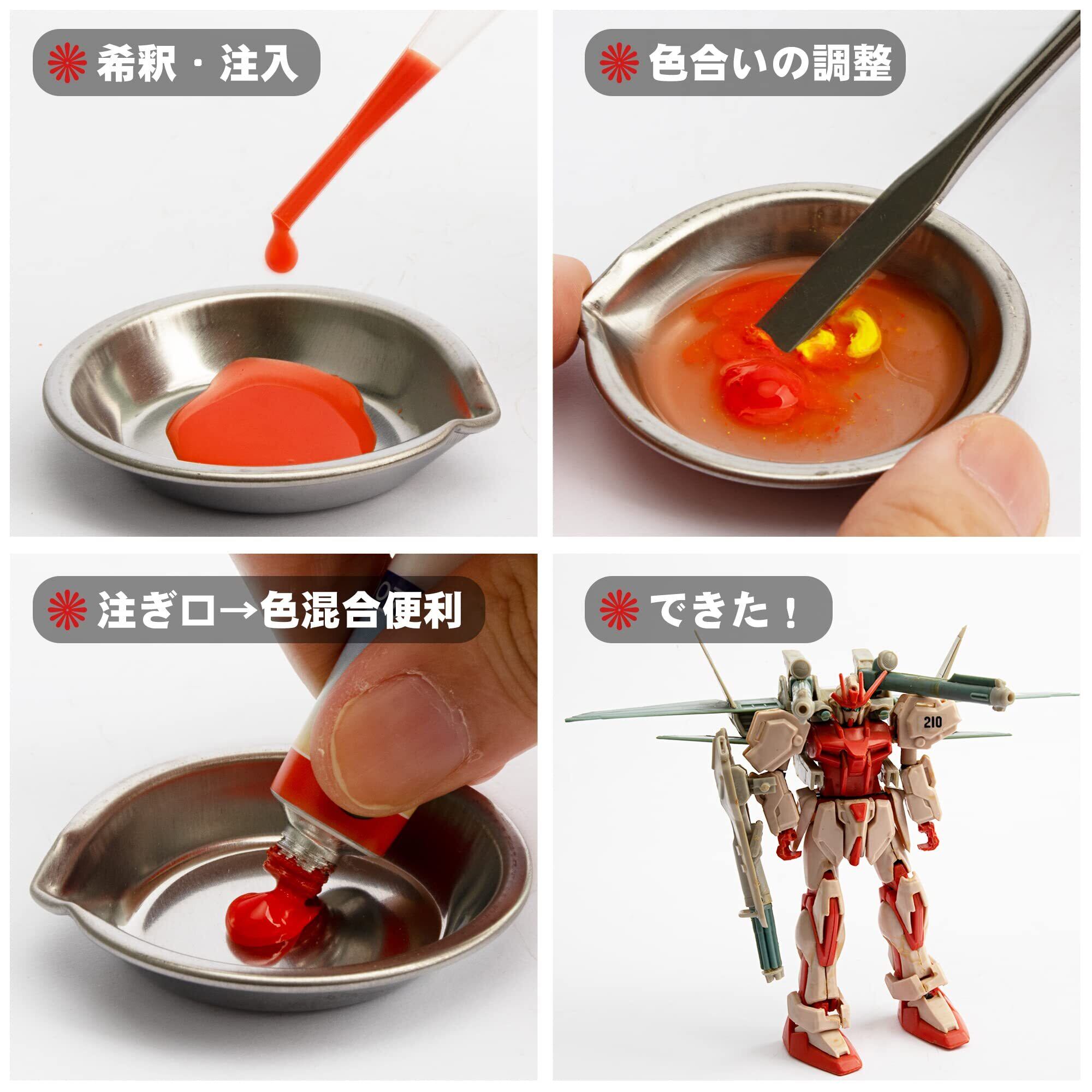 塗料皿:12個 同時に複数の色を使用することができます。素材は金属製なので耐久性が良い、注ぎ口ありで色の混合と移すは便利です。 スポイト:3ml 塗料の希釈、注入、移すなどの場合に役に立ちます。それにより厚い素材で作られ、液体が漏れることは心配なくて、使用便利です。 調色スティック:15cm 高品質なステンレス素材、塗料の色合いが調整しやすいです。