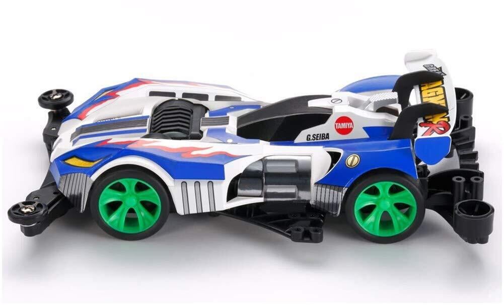 ミニ四駆マンガ「レッツ&ゴー!!リターンレーサーズ!!」で活躍する主人公、「星馬豪」の中学生時代のマシン。 エッジの立った低くワイドなボディや風の流れを整える大型のリアウイングなど、力強い走りを感じさせるフォルムが特徴。 ボディはホワイトのABS樹脂製。 レッドとブルーで情熱をアピールする炎のグラフィックや、マーキング、ヘッドライトなどはメタリック調ステッカーで用意。 ノーズのボンネットパネルは取り外しでき、トランクスペースを用意。 直径11.5mmのマスダンパーウェイトなどを収納することで、重量バランスのセッティングが可能。 重心が車体のフロントよりにあるのでアップダウンが多いコースでも安定感のある走りが可能。 フロント下部に低摩擦樹脂製のスキッドバーを標準装備したのをはじめ、4個のローラーも低摩擦樹脂製。 特にリヤローラーは安定性を高めた8mm厚タイプ。 シャーシ本体はABS樹脂製、アンダーパネルやスキッドバーなどのAパーツはブラックの低摩擦樹脂製。 蛍光グリーンが鮮やかなAスポークホイールには、小径ローハイトタイヤを装着。 3.5:1の超速ギヤ、モーターつき。 ※この商品は、組み立てが必要なキットです。 ※組み立てには別途、工具等が必要です。 ※単三電池 (2本)は別途ご購入ください。