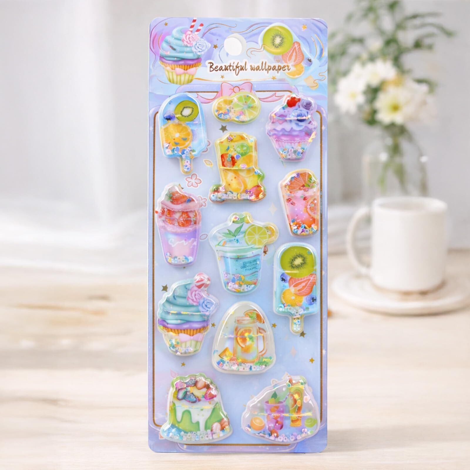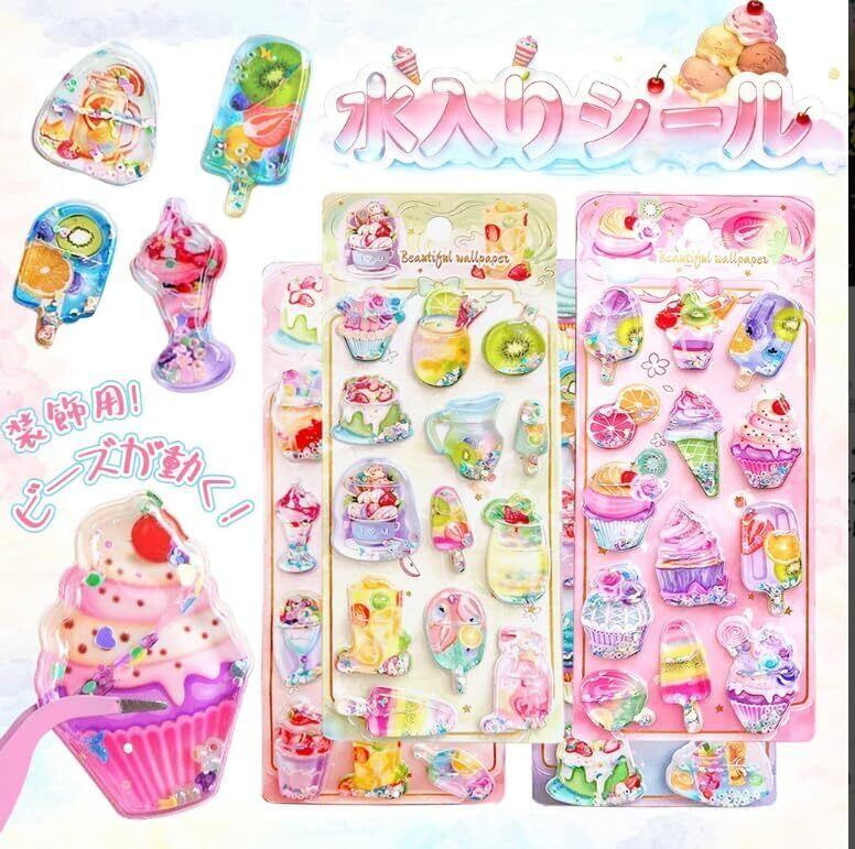 2026年・再再再再入荷!立体シール デザイン かわいい 癒し系 厚みあり もっちり触感 帳・手帳・日記帳・ノート・スマホケース対応 DIYデコレーション ご褒美 文具 手芸 プレゼント用 女の子・男の子 子供向け (水入りシールA(4枚入り))