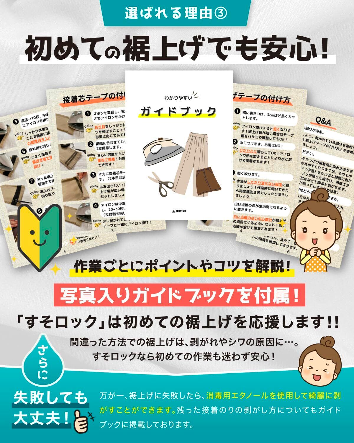 すそロック 超強力 綺麗に剥がせる 洗濯可 写真付きガイドブックをマネするだけ アイロン接着 裾上げテープ BOSSTAGE (ブラック, 5m)