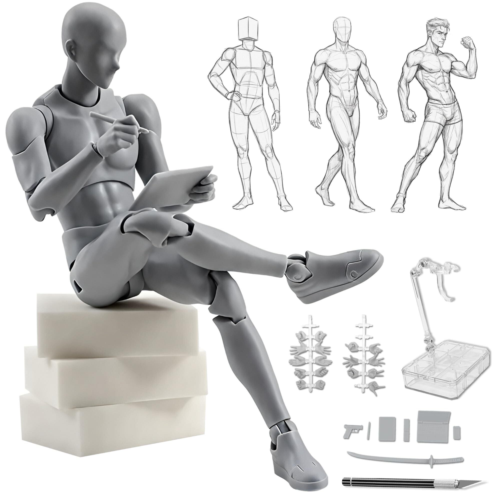 CHALAN デッサン人形 可動フィギュア 30個関節可動 スタンド付き デッサンドール 全身ドール 人体模型 マネキン 男性 女性 ポーズ 素体 スケッチ 筋肉体型 作画 モデル キャラクター 練習 美術 小道具 模型 男性-グレー