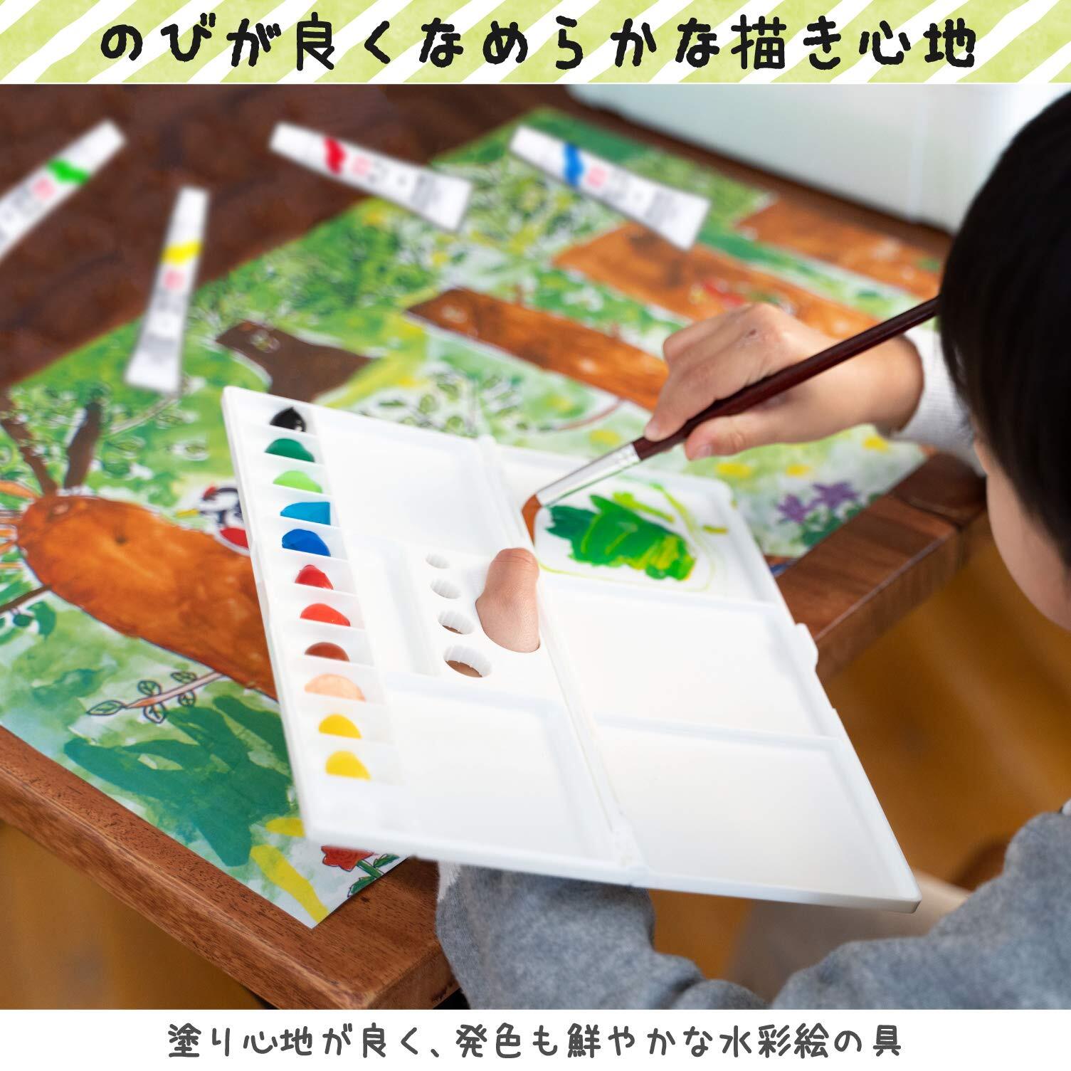 【セット内容】水彩絵の具12色(ラミネートチューブ入り)、画筆大(12号)・小(6号)各1本、筆筒、パレット、筆洗、筆ふきスポンジ