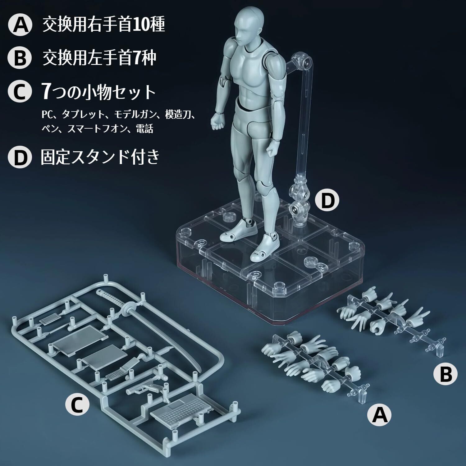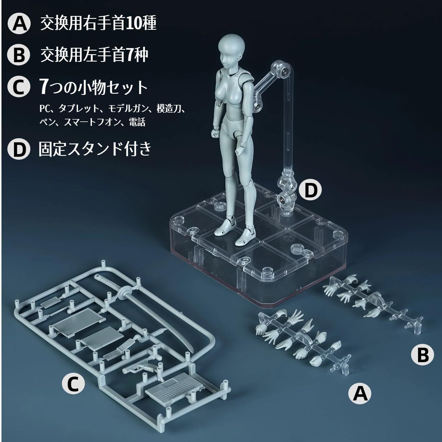 【男性版・女性版の内容物】PVC本体、交換用右手首10種、交換用左手首7種、ミニブック、PC、タブレット、ペン、スマートフォンなど、携帯電話、専用台座、ケース+手首ホルダー ※ケースは台座で蓋をすることができます。気軽にパーツを取り替えて好きなポーズを取らせることが可能。プロな描く練習として、人の各動きをもっと把握することができ、絵をより鮮やかにします。