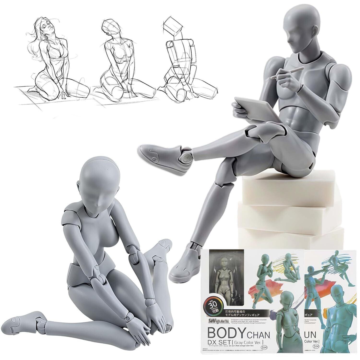 【在庫セール】デッサン人形 関節可動30ヶ所 男性&女性モデル スタンド付き 漫画・美術用 筋肉表現可能 デッサンドール スケッチモデル フィギュア 作画練習 美術教材 プロ用 可動式素体 ポージング人形 (グレー*2)