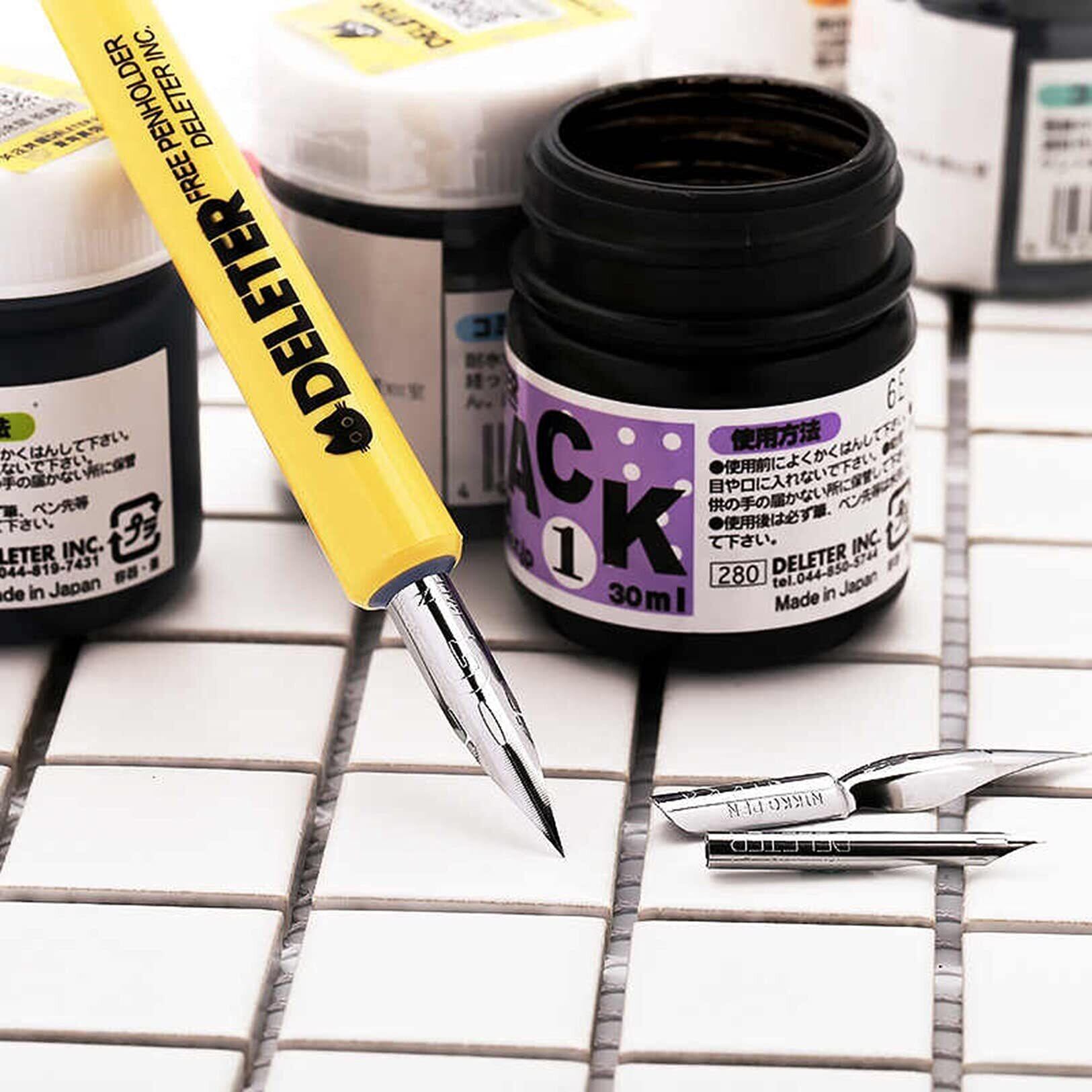 多くのペン先に対応するデリーターフリーペン軸が、お試し入門キットで登場! ・ 内容物 ・ 1、デリーターフリーペン軸 2、Gペン・丸ペン・サジペン各1本 3、原稿用紙ハガキサイズ3枚 フリーペン軸は、ペン先をセットしインクにつけて使うペン軸です。 これ一本で円弧サイズの違う丸ペン・Gペン・サジペン (タマペン) ・スクールペンがご使用いただけます