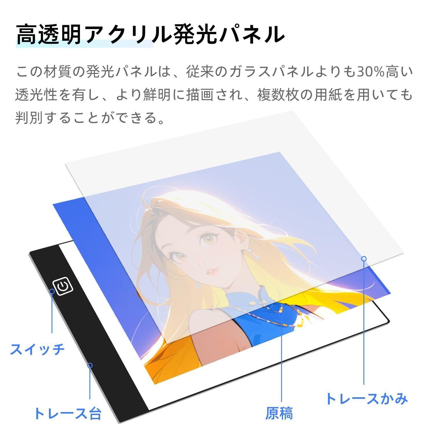 【4000Lux高輝度LED】最大4000Luxの明るさを提供し、トレースや細かい作業もくっきり見やすく。パネルはアクリル素材を使用しており、均一な光を提供し、長時間使用しても目に優しいです。