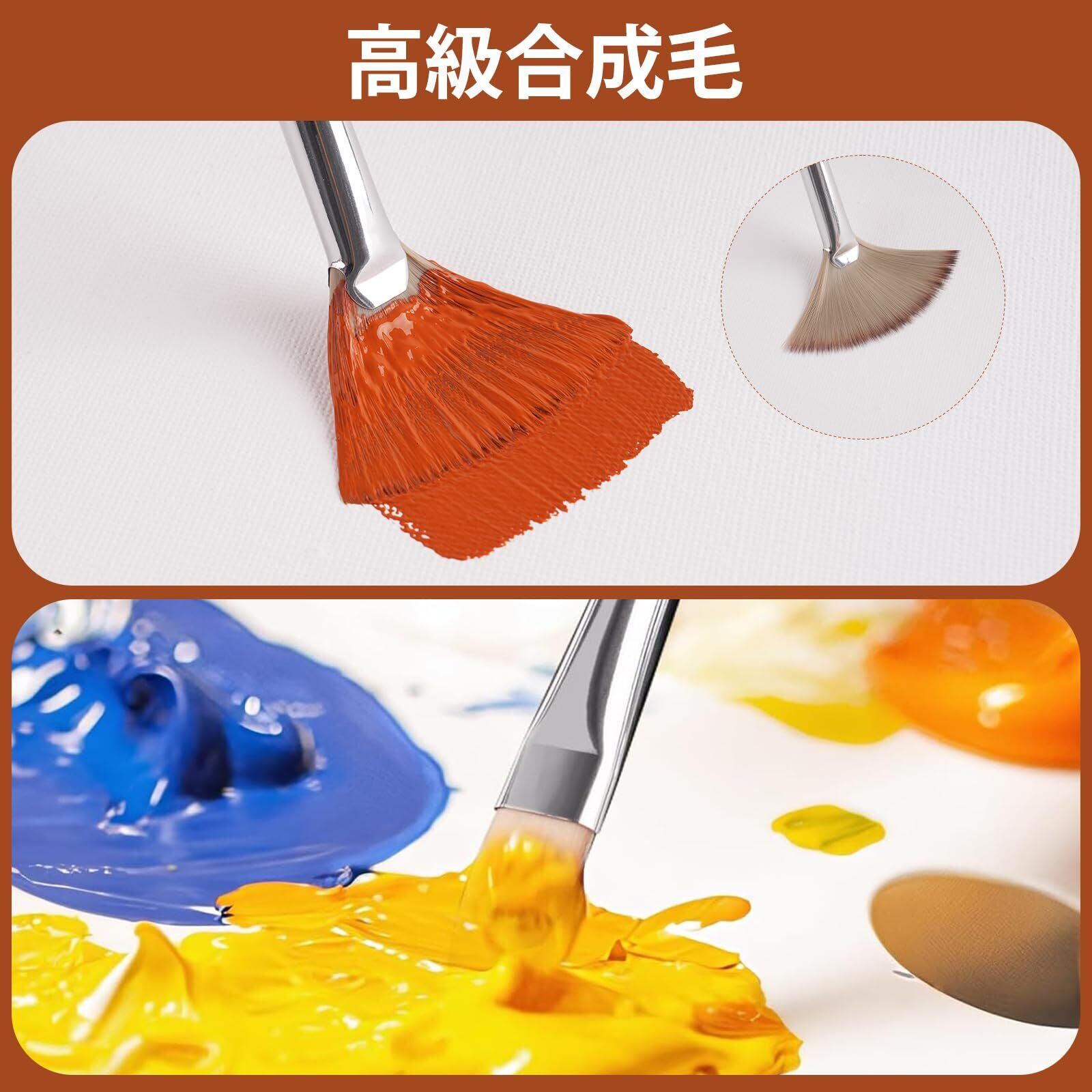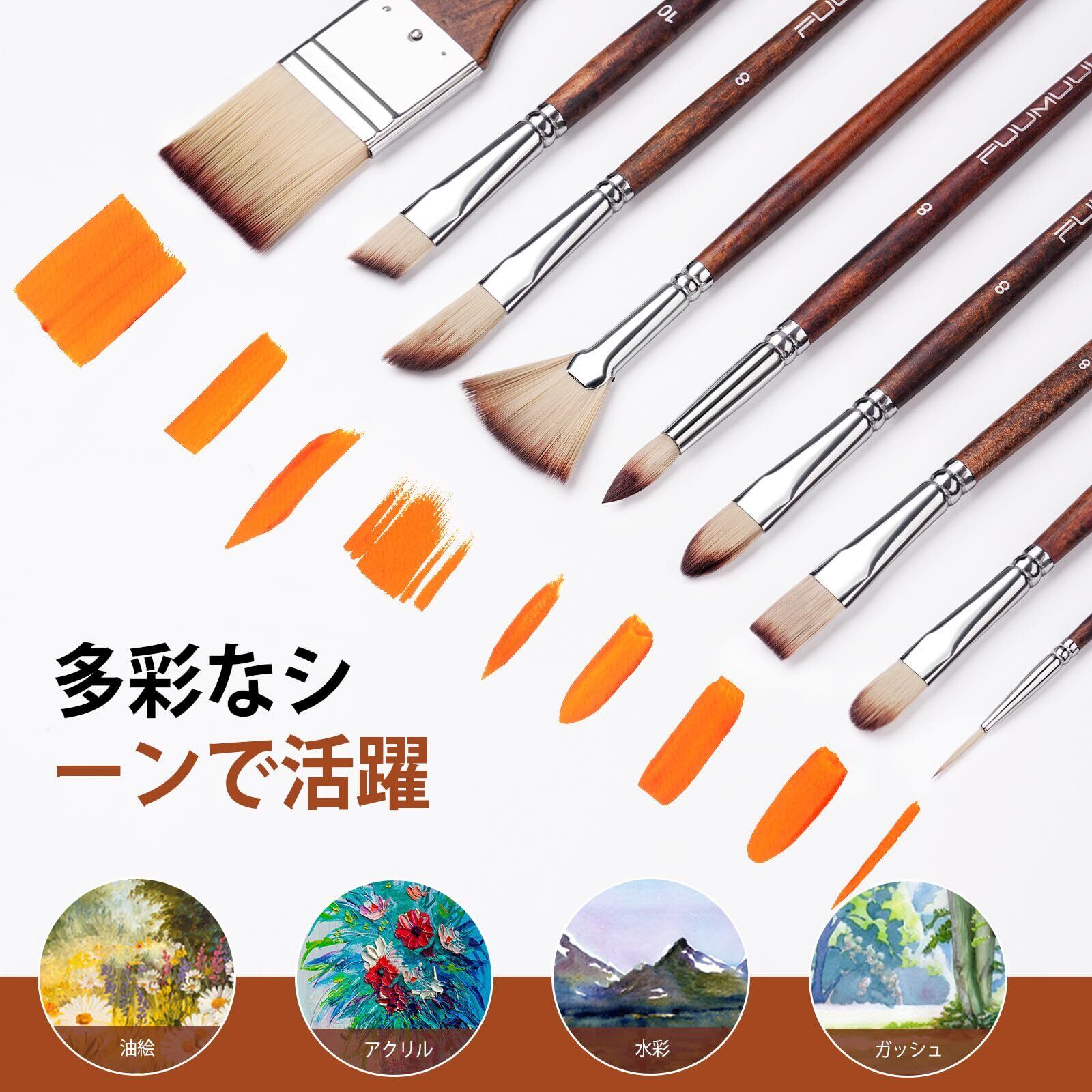 【高品質合成毛の特徴】柔らかい合成毛は優れた顔料保持力と色彩制御能力を備え、絵具を常にスムーズに流れさせます。圧力が加わっても反りや割れが発生しにくい耐久性設計で、長期間の使用に耐えます。毛先は洗浄・水洗いが簡単で、新品のような外観を維持できるメンテナンス性の高さが特徴です。
