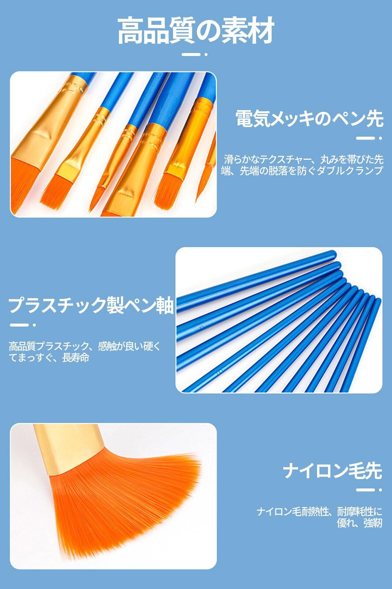 【新春セール】筆 絵の具 筆 画材 10本セット 油筆 水彩筆 アクリル筆 平筆 丸筆 ナイロン毛 短毛筆 大人用・子供用サイズ (ブルー)