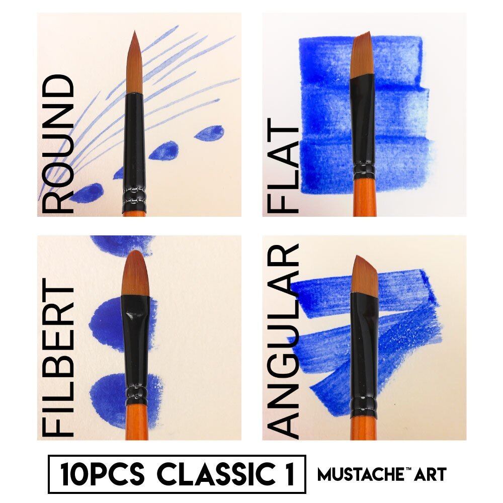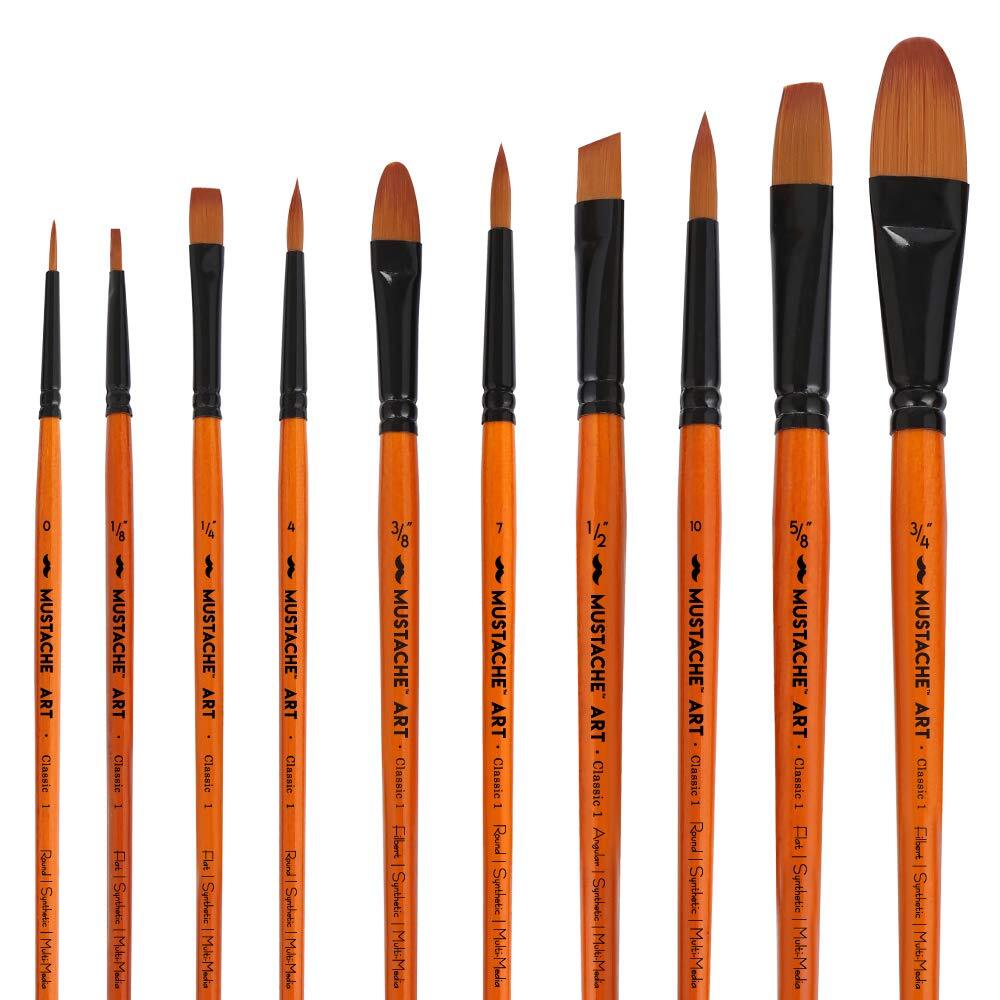 ブラシの品揃え:10個のアーティストブラシセット:フラット形状:1/8 "、1/4"、5/8 "|フィルバート形状:3/8"、3/4 "|円形形状:0、4、7、10 |角度形状:3/4"